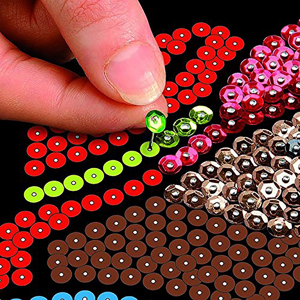 Children will have great fun creating a sparkling picture with this sequin art red set. Pin the full color pre-printed design onto the polystyrene frame and decorate with sparkling colored sequins. Simply match the colors of the sequins to the design. Provides hours of fun creating a sparkling picture. The kit comes complete with all the pins and sequins required to produce the colorful design. The sequins shimmer and sparkle and the pinheads also reflect the light. Made in the UK by KSG. Typically takes around 5 to 6 hours to complete, then you can display for all to see. Contents: Framed polystyrene base, pre-printed colour design/picture, packets of colored sequins, pins and instruction leaflet.