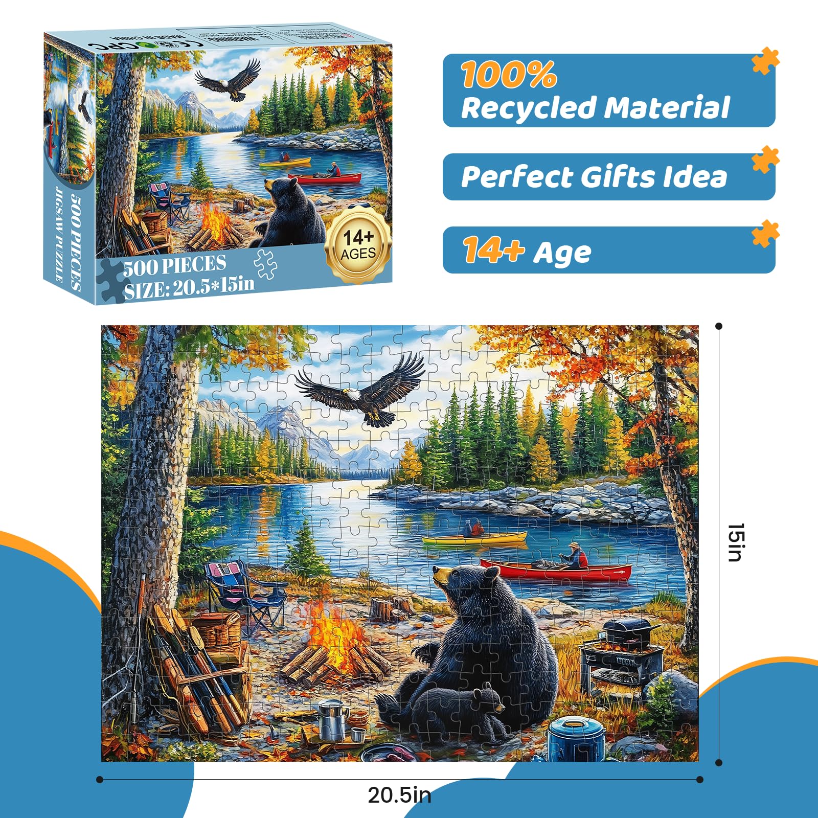 Experience the beauty of nature with our 500 Piece Puzzles for Adults. This exquisite jigsaw puzzle features a captivating scene of majestic black bears and soaring eagles gathered around a cozy bonfire, providing a serene riverside setting that is perfect for all ages. Measuring 20.5 x 15 inches (52 x 30 cm) when completed, it serves not just as a puzzle but also as a stunning piece of wall art.