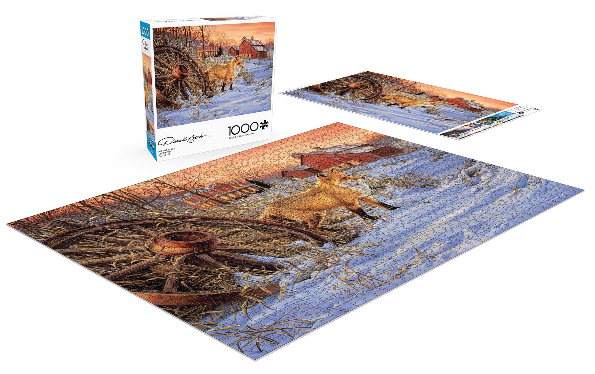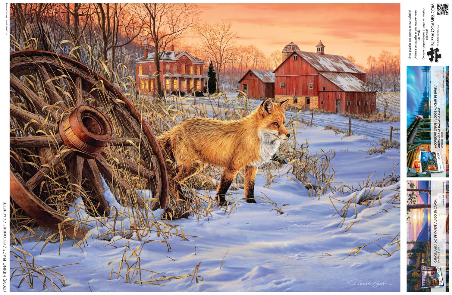 Immerse yourself in the serene beauty of nature with the Hiding Place, a captivating 1000-piece jigsaw puzzle from the renowned Darrell Bush collection by Buffalo Games. This exquisite puzzle features a timid fox emerging from its leafy hiding place on a snowy farm, providing a tranquil winter scene that promises hours of engaging entertainment.