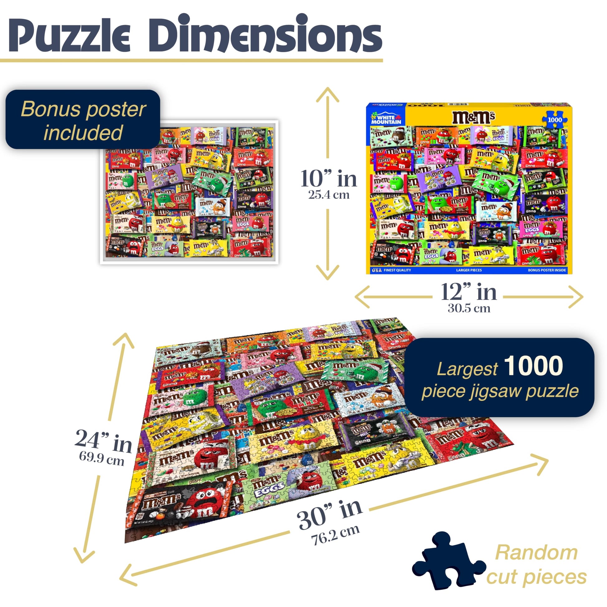 - Q: What is the finished size of the White Mountain Puzzles - M&M's jigsaw puzzle? A: The finished size of the White Mountain Puzzles - M&M's 1000 piece jigsaw puzzle is 24 inches by 30 inches.