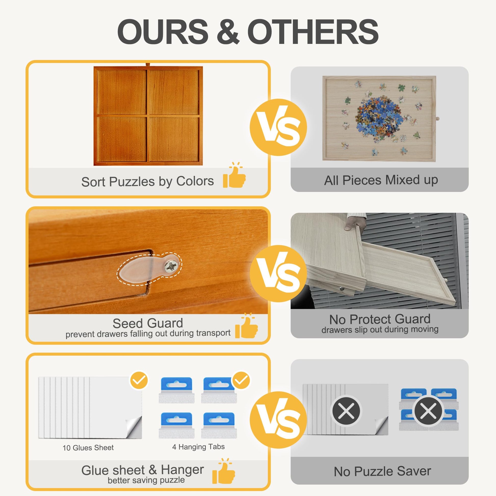 - Q: Does the puzzle table come with storage options? A: Yes, the HALLYBEE Puzzle Table is equipped with 4 drawers that allow you to categorize and store your puzzle pieces by color, theme, or border, ensuring easy access and organization.