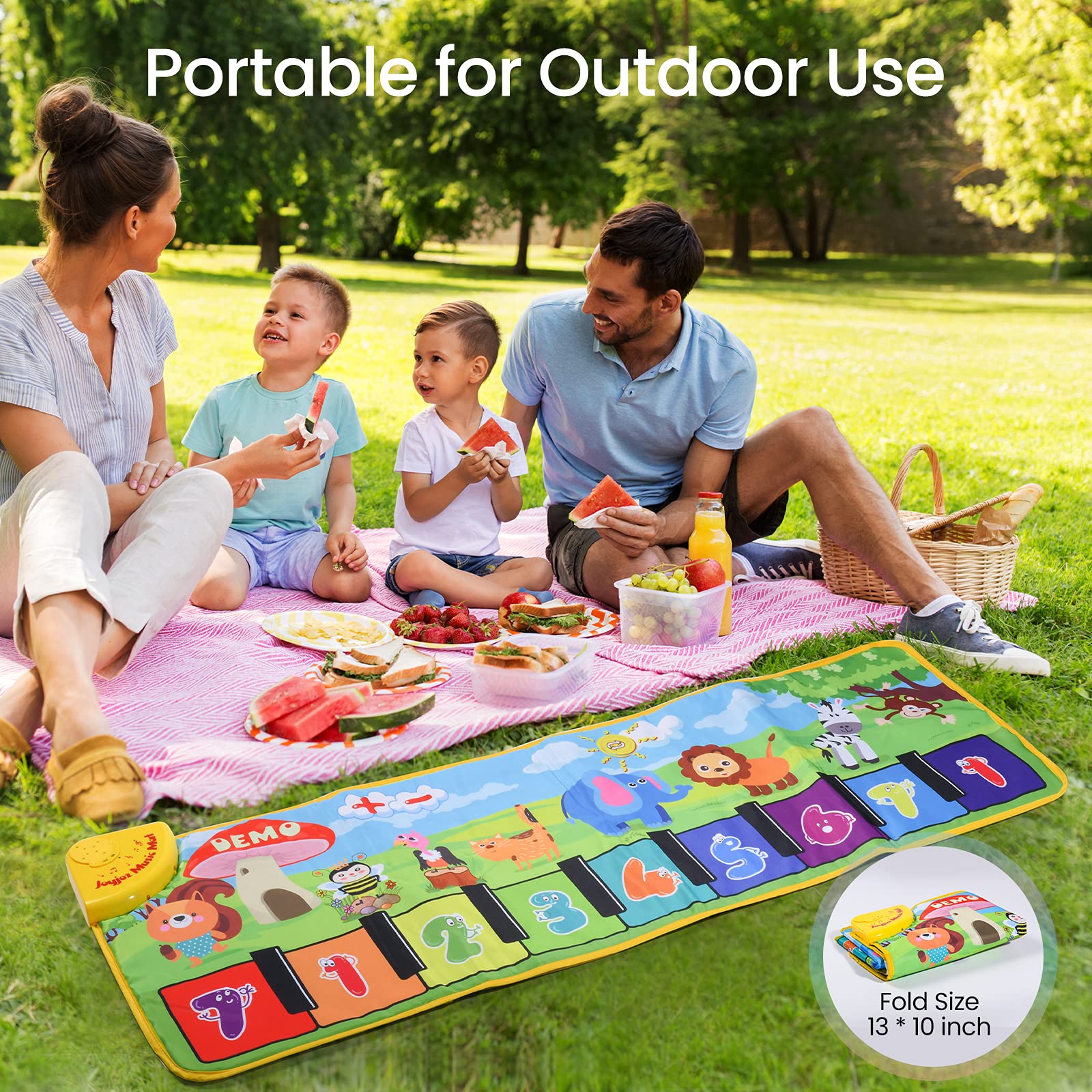 Joyjoz Early Education Toy - Large Music Dance Mat 51 inch piano mat large enough for your kids to dance on the cute keys, a fun and safe musical toys for your baby that are good for brain development, helps children build confidence and share happy times with friends and family. Size: 51 x 17 8 Animal Sounds 9 Cute Keys 9 Kinds of Demo Songs Record & Playback Function Adjustable Volume Large Enough for Kids Play 51 x 17 inch large size, big than normal floor piano in market, kids can play in the piano mat with pet, friends or family and not crowded Early Education Colorful pattern and vivid animal design train aesthetic appreciation, develop childrens sense of touching and feeling, many kinds of songs and animal sounds develop childrens logical thinking ability and judgment ability. Joyjoz floor piano mat is a perfect early education toy for kids. 26 Animal Identification Card The musical toy equipped with a set of A to Z knowledge card containing 26 kids of animal words and phonetic transcription, help to promote babys cognitive ability as well as memory. 8 Vivid Animal Sounds Squirrel, bee, bird, cat, elephant, lion, zebra, monkey Package Include: 1 Piano Mat 1 Instruction Manual 26 Animal Identification card