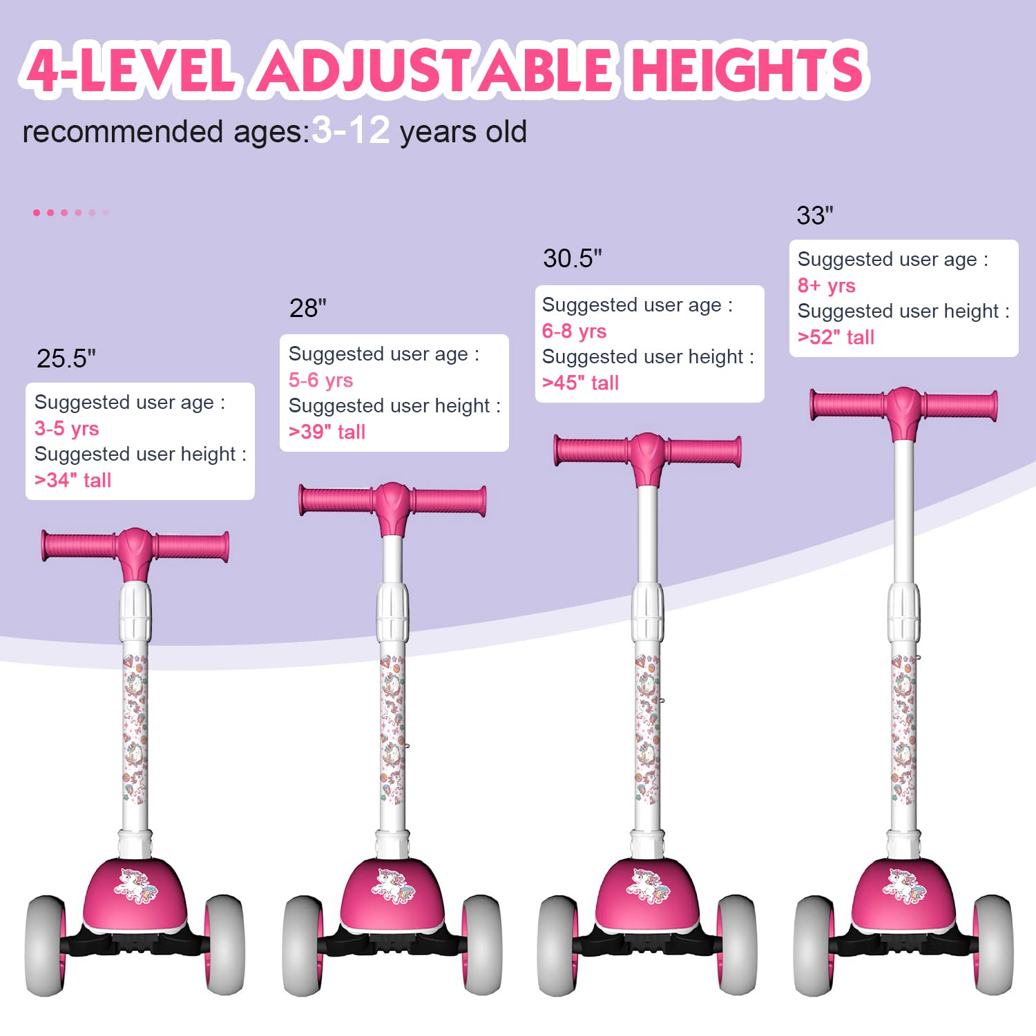 - Q: How do the adjustable heights work on this scooter? A: The scooter features four adjustable height options (25.5", 28.0", 30.5", and 33") to grow with your child, ensuring a comfortable riding experience as they develop.