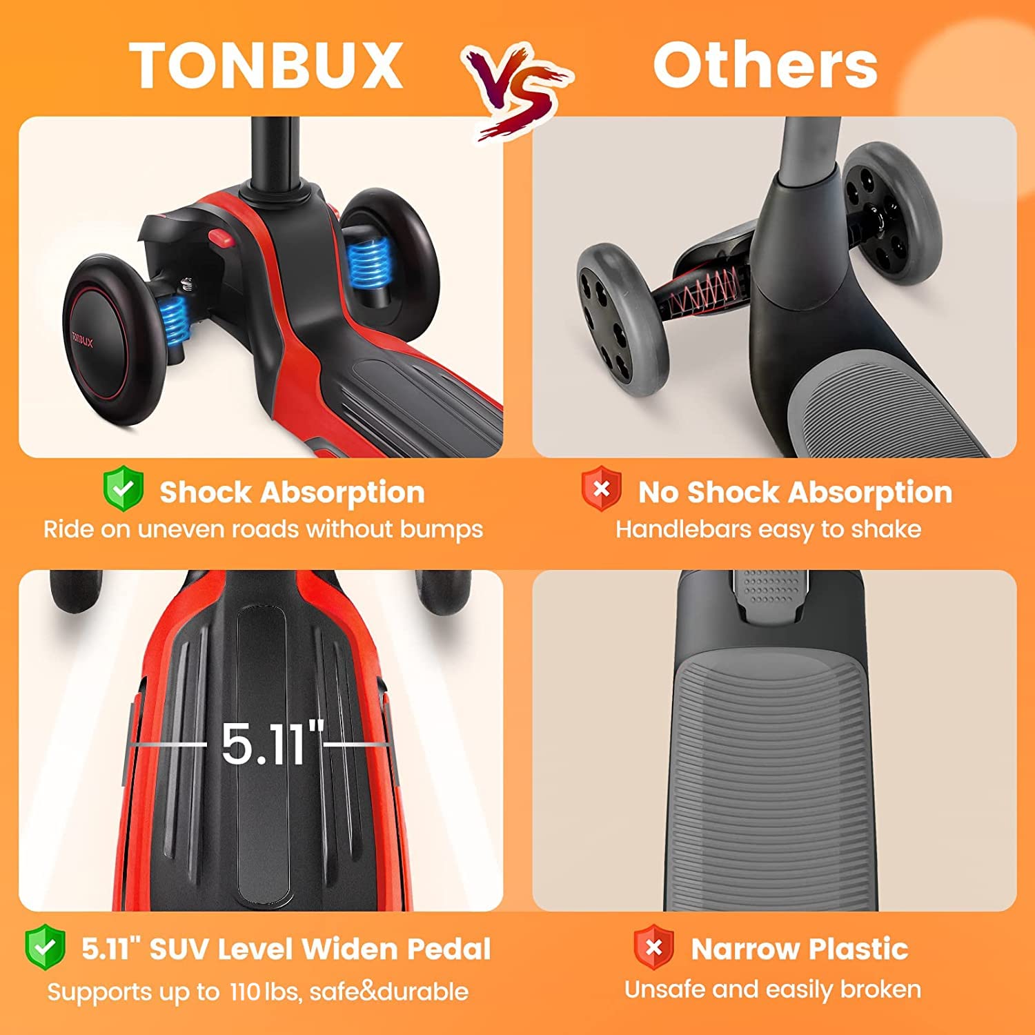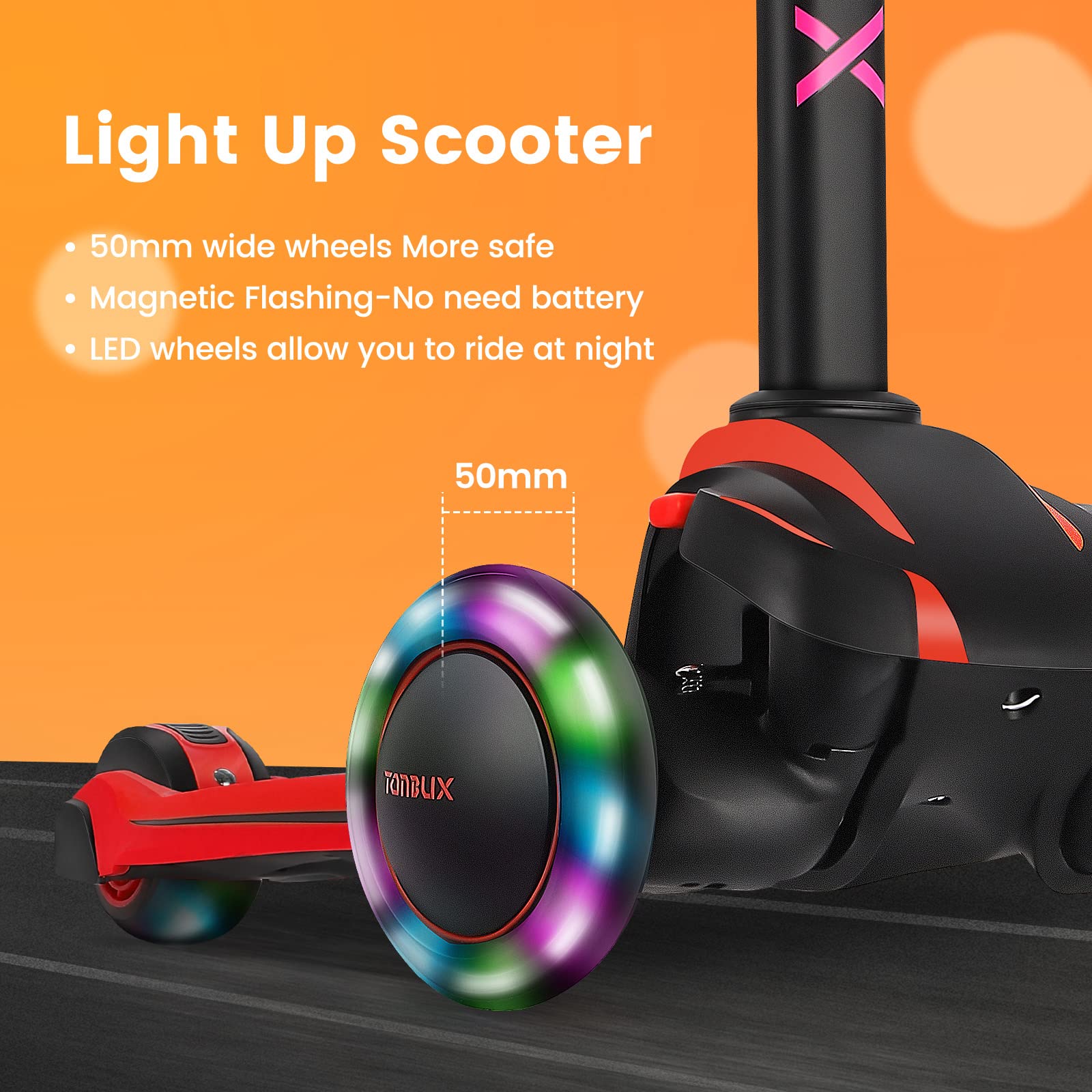 View compareTonbux Kids Scooter For Age 3-12, Toddler Scooter With 4 Adjustable Heights, Light Up 3-Wheels Scooter, Shock Absorption Design, Lean To Steer, Balance Training Scooter For Kids - Red
