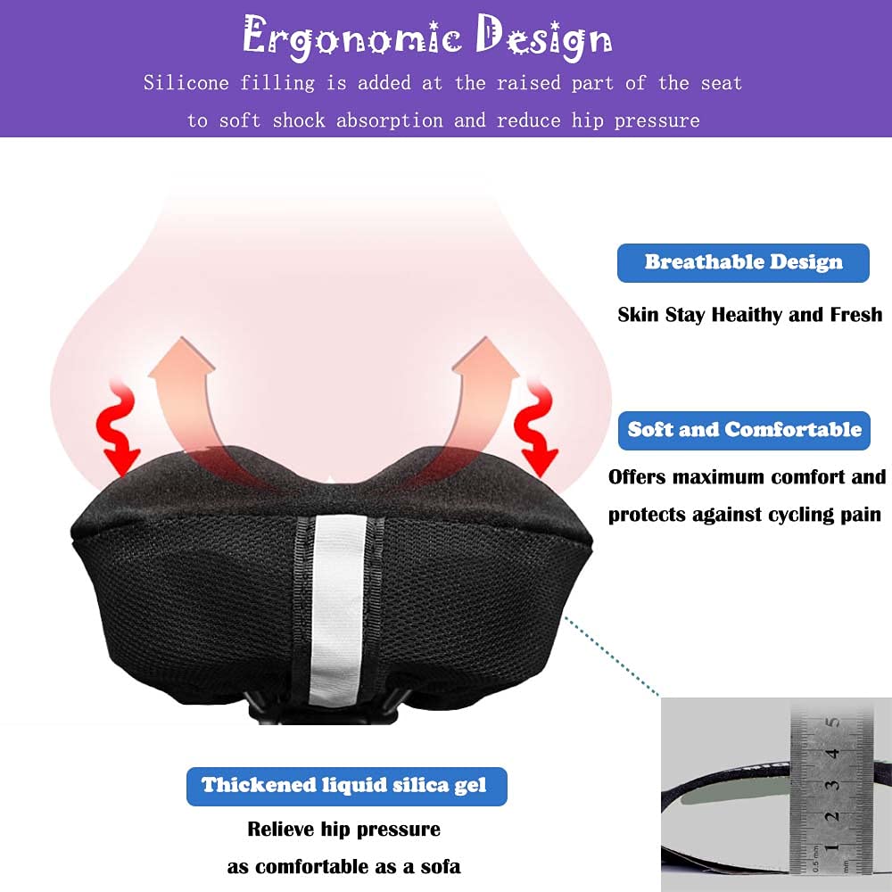 ?Bike Seat Cushion Specially Designed for Children?Soft kids gel bike seat cushion is padded with transparent silica gel, and surface is made of stretchy lycra material. High quality memory foam and gel padding exert no harm to health. Lycra fabric on the surface features greater moisture absorption and can help reduce muggy feeling. Gel padding absorbs shock and reduces pain effectively.Better protect your butts. Offering child most comfortable riding experience | ?Ergonomic Design?Ergonomic Concave Design, a Good hip support for your Child/Kids. The 9x 6 inch design makes the saddles fit snugly on most child bike seats, offering children the most comfortable riding experience and fun. Please measure the size of your bicycle seat before purchasing. It will NOT FIT OVERSIZE BIKE SEATS | ?Waterproof & Dust Resistant Cover?Coming with waterproof and dust-proof seat cover, which can protect the seats in rainy days or on the dusty road, just remove it and you can be ready for the ride. Tail reflective stripe can reflect surrounding lights, making your kids riding safer | ?Non-Slip Design & Easy Installation?Anti-skid leather, drawstring and 2 extra straps can effectively prevent the kids bicycle seat cover from sliding. No tools needed, very easy to install | ?After-sales guarantee?We have full confidence in the quality of the product. At the same time, we hope to make every customer shopping in our shop have a good shopping experience. If you are not satisfied with the received product or have quality problems,please contact us