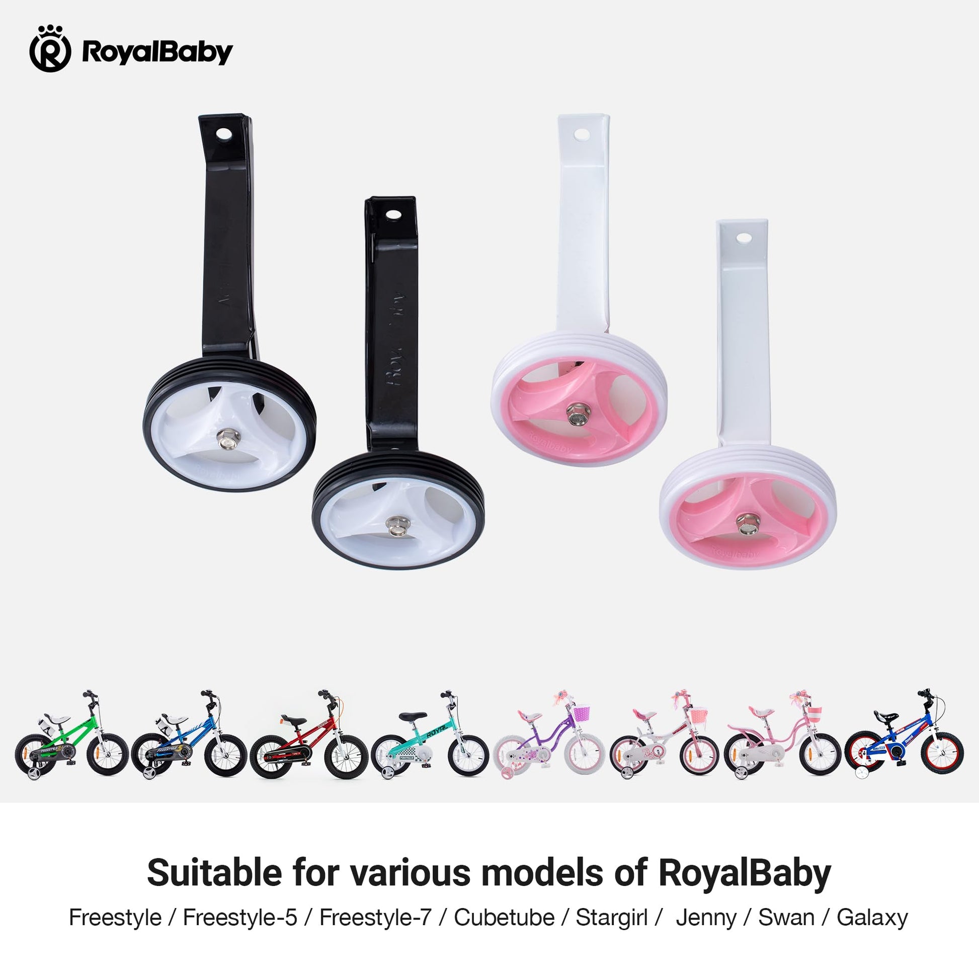 The RoyalBaby Training Wheels are compatible with a variety of models including RoyalBaby Freestyle, Freestyle-5, Freestyle-7, Space Shuttle, Cubetube, Stargirl, Jenny, Swan, and Galaxy. This compatibility means that no matter which RoyalBaby bike your child has, these training wheels can easily be fitted, offering a versatile solution for parents.