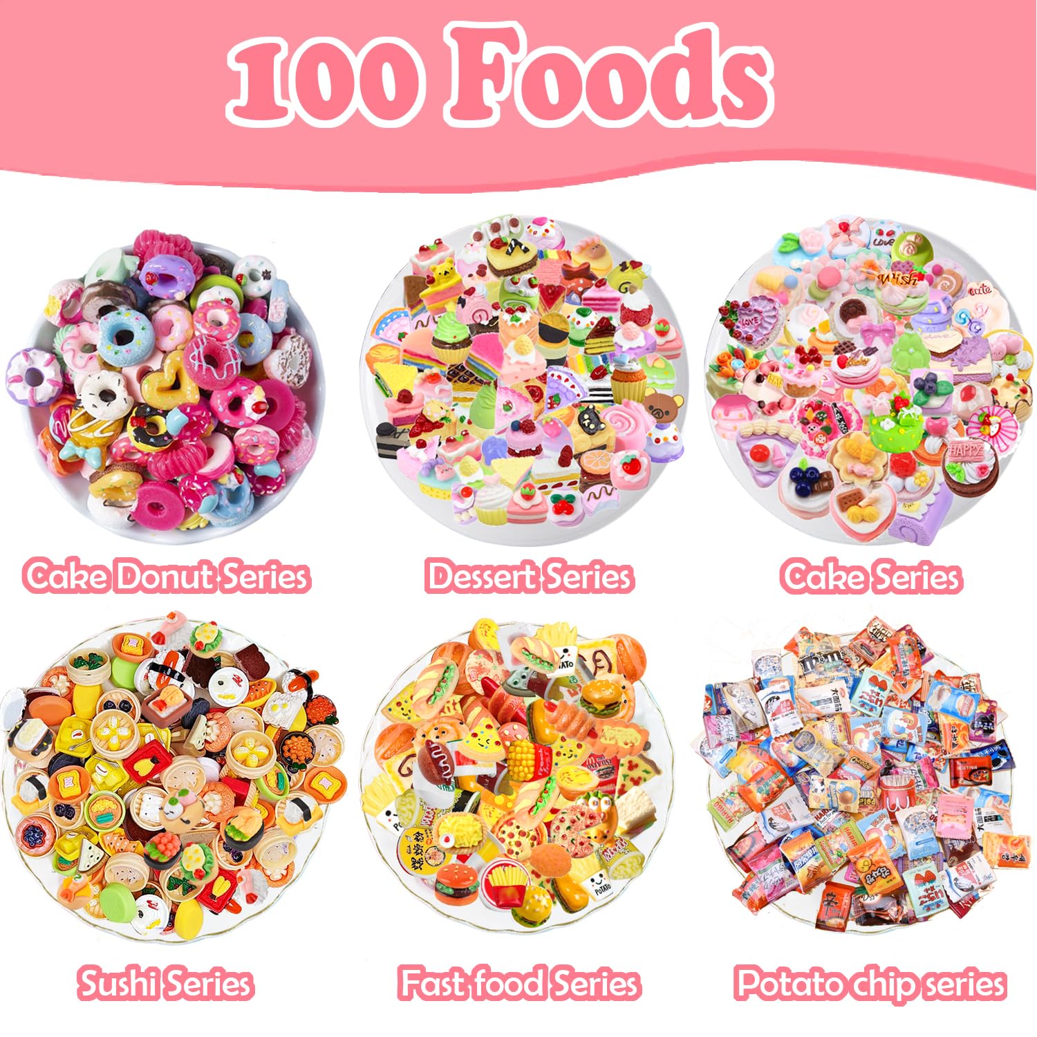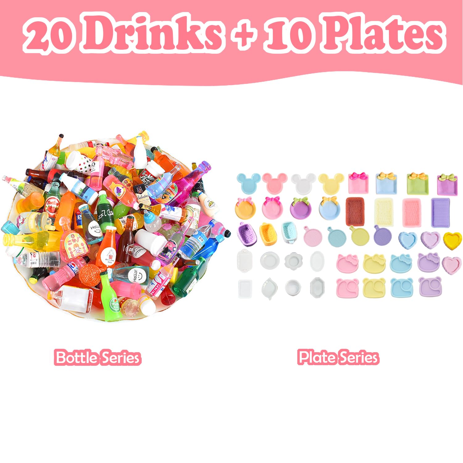 Cute miniature food decorations set, mini drink bottles and food wrappers including: food, drink bottle, hamburger, fries, coke, coffee, cake, jam, pudding, cake, milk tea, bread, chocolate, ice cream, milk, drink, donut, Chinese food, sushi, toast, kitchenware, tableware and more, perfect for your pretend kitchen Cook and deliver meals for dolls or friends! Products include: 100 * miniature food 20 * miniature drinks 10 * plates 10 * cups 10 * cookwares Specifications: Material: resin Color: multicolor Multiple uses: Not only for 1:12 dollhouse pretend kitchen games, but also for DIY phone cases, stationery box decorations, cake top decorations, making hairpins, all good choices. Suitable for role play between parents and children, enhance your interaction and affection, create w arm and happy memories. Perfect gift: These miniatures can be used as birthday, Christmas, Halloween, Thanksgiving gifts for partners, family, friends and anyone who likes to decorate miniature houses. The recipient of such a gift will be delighted to have a mini food store that adds to the fun of interacting with playmates. Note: Choking hazard - small parts, please keep away from people under 12 years old to avoid choking risk.