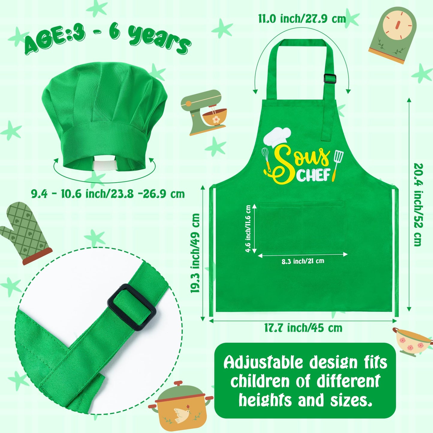 Kid Apron and Chef Hat Set - R HORSE 2Pcs Adjustable Children Green Kitchen Apron Features: Kids apron and chef hat can keep children away from stains when they help you cook or bake in the kitchen. The sous chef apron and chef hat set is ideal gifts for children, as well as necessary costumes for children's baking, role-playing, and birthday parties. Material: Polyester fabric Size: Apron:17.7 x 20.4 inch/45 x 52 cm Chef Hat:9.4 - 10.6 inch/23.8 - 26.9 cm Neckband:11 inch/27.9 cm Waistband:11 inch/27.9 cm Package: 1Pcs green kids apron 1Pcs green chef hat