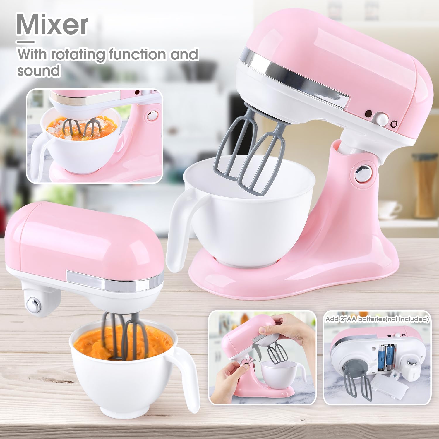 - Q: What kind of functions do the kitchen appliances have? A: The kitchen appliances, including the coffee maker, blender, and mixer, feature realistic functions such as sound effects and moving parts, allowing kids to engage in authentic pretend play.