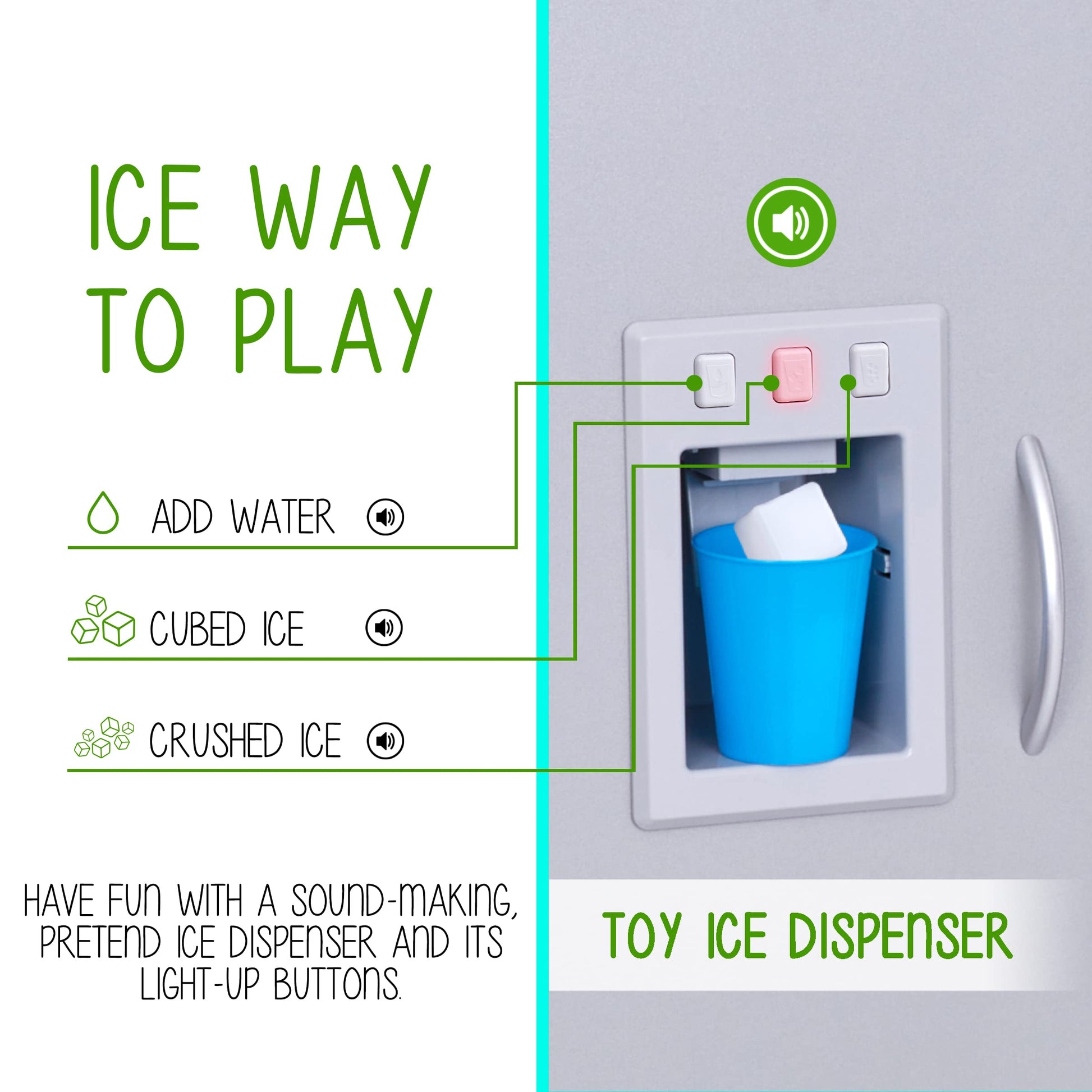 - Q: What features make this kitchen set realistic for kids? A: The Lil' Jumbl kitchen set includes realistic sights and sounds such as a battery-operated ice dispenser, microwave, and burners with light and sound effects, allowing kids to immerse themselves in a lifelike cooking experience.