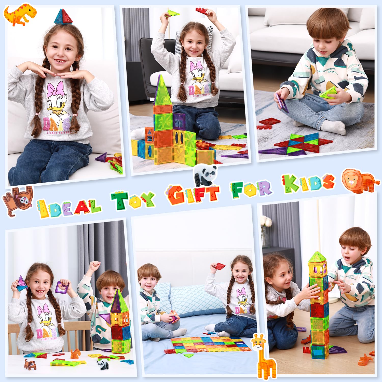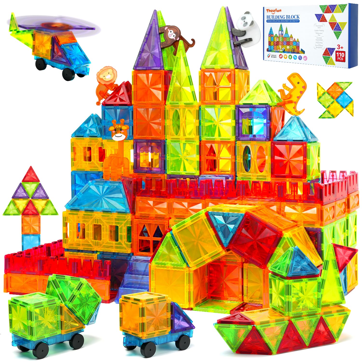 Magnetic Tiles 110PCS 3D Animals Magnet Tiles with 2 Cars Kids Magnet Building Blocks STEM Educational Magnet Toy Set Constructi