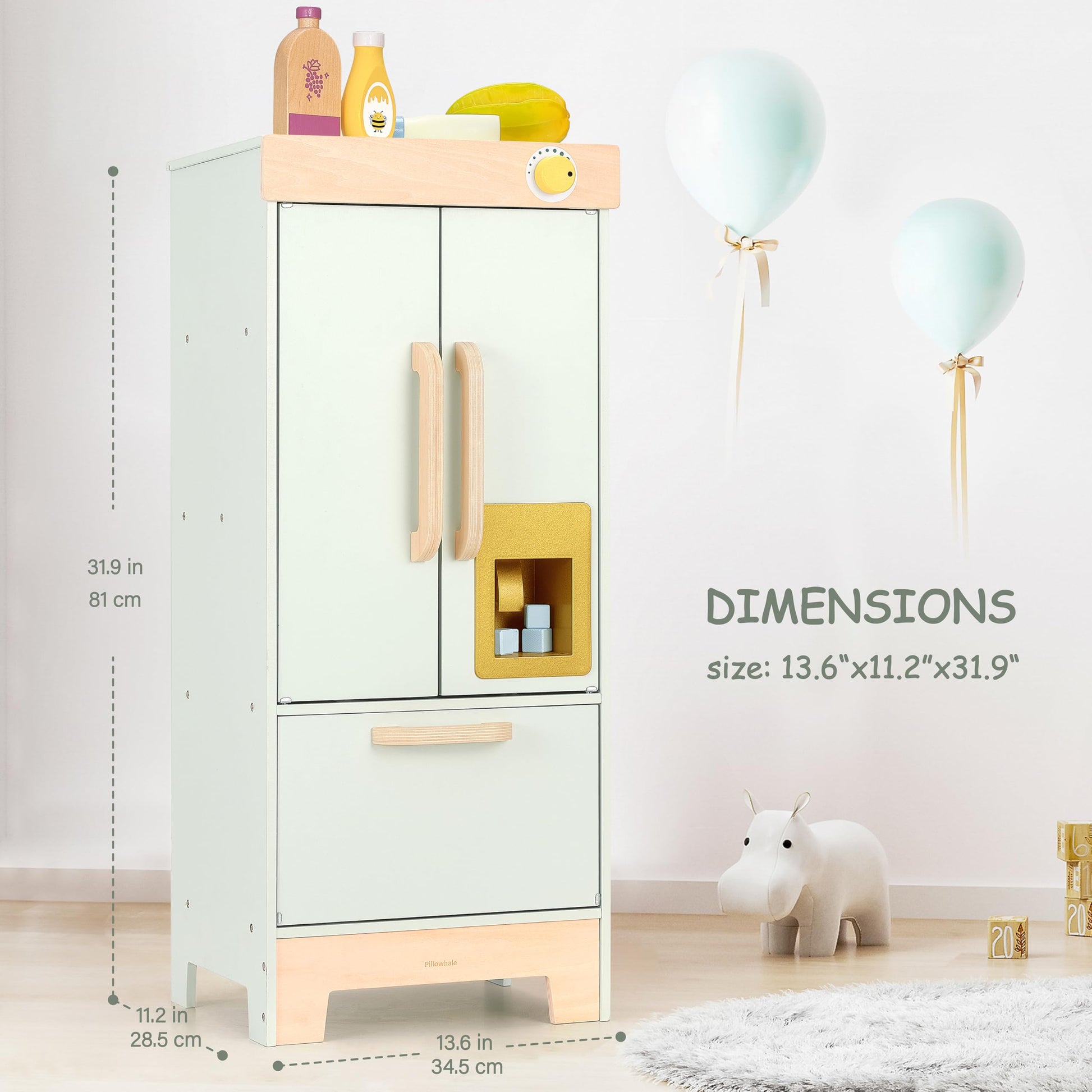 Pillowhale Wooden Play Refrigerator with Ice Maker - Mint Green Kids Fridge Toy, 4 Wooden Ice Cubes & Cup, Quiet Click Handle, M