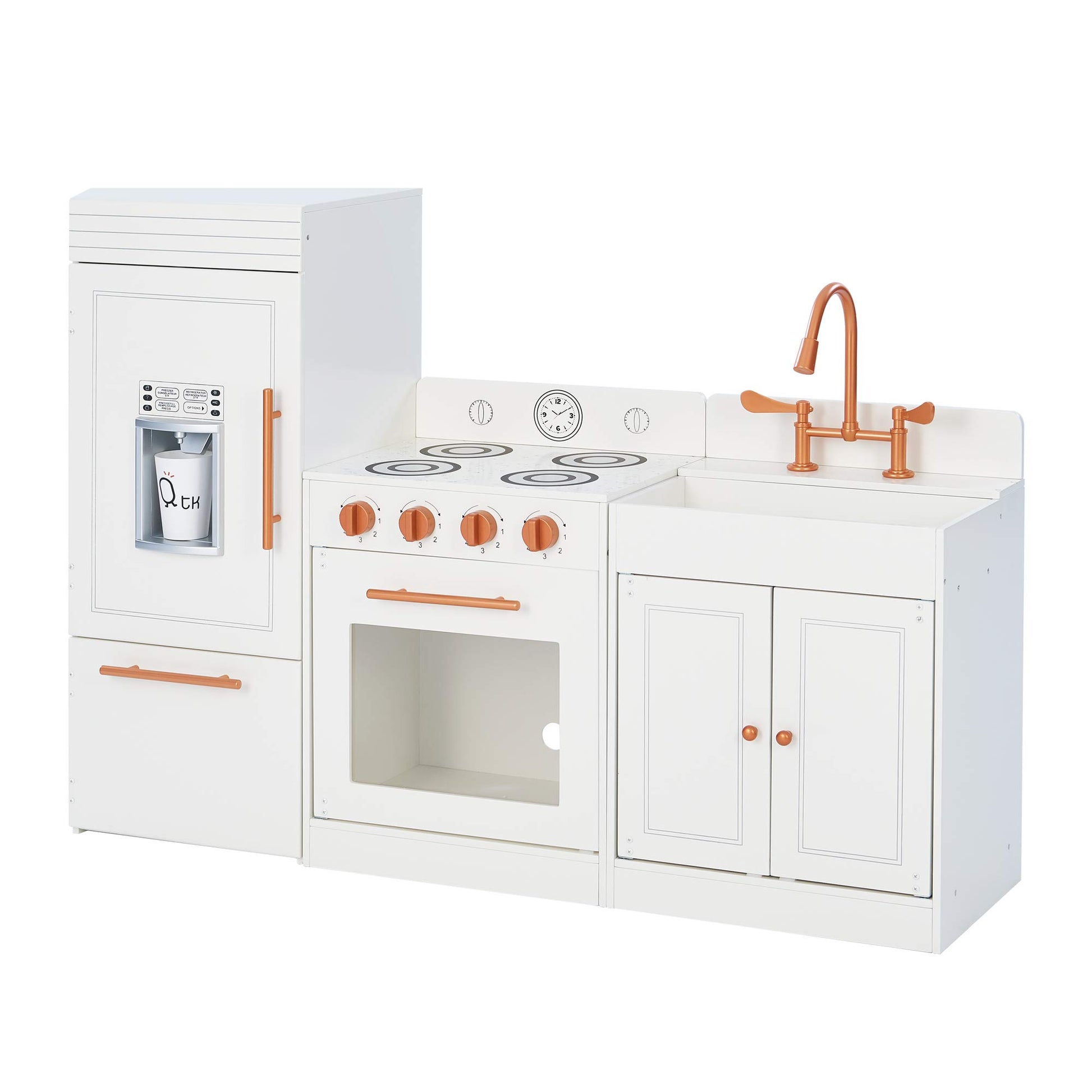 The Little Chef Paris Modular Wooden Play Kitchen comes in three units, all in a sleek white finish with rose gold hardware. The refrigerator features a working pretend ice dispenser, the oven has knobs that turn and make clicking sounds, and the deep farmhouse-style sink features a vintage-style faucet with realistic handles that turn. Designed to be versatile in play areas of many shapes and sizes, the interactive features and attention to details spark a child's imagination. Teamson Kids play kitchens feature ample storage space so play food and dishes aren't lost and clean-up is easy. Certified safety tested, using lead- and phthalates-free non-toxic paints. Since 1997, Teamson Kids has given flight to fun, discovery, and learning through beautifully crafted, safe, and contemporary furniture pieces and toys for kids with a spirit of curiosity and adventure.