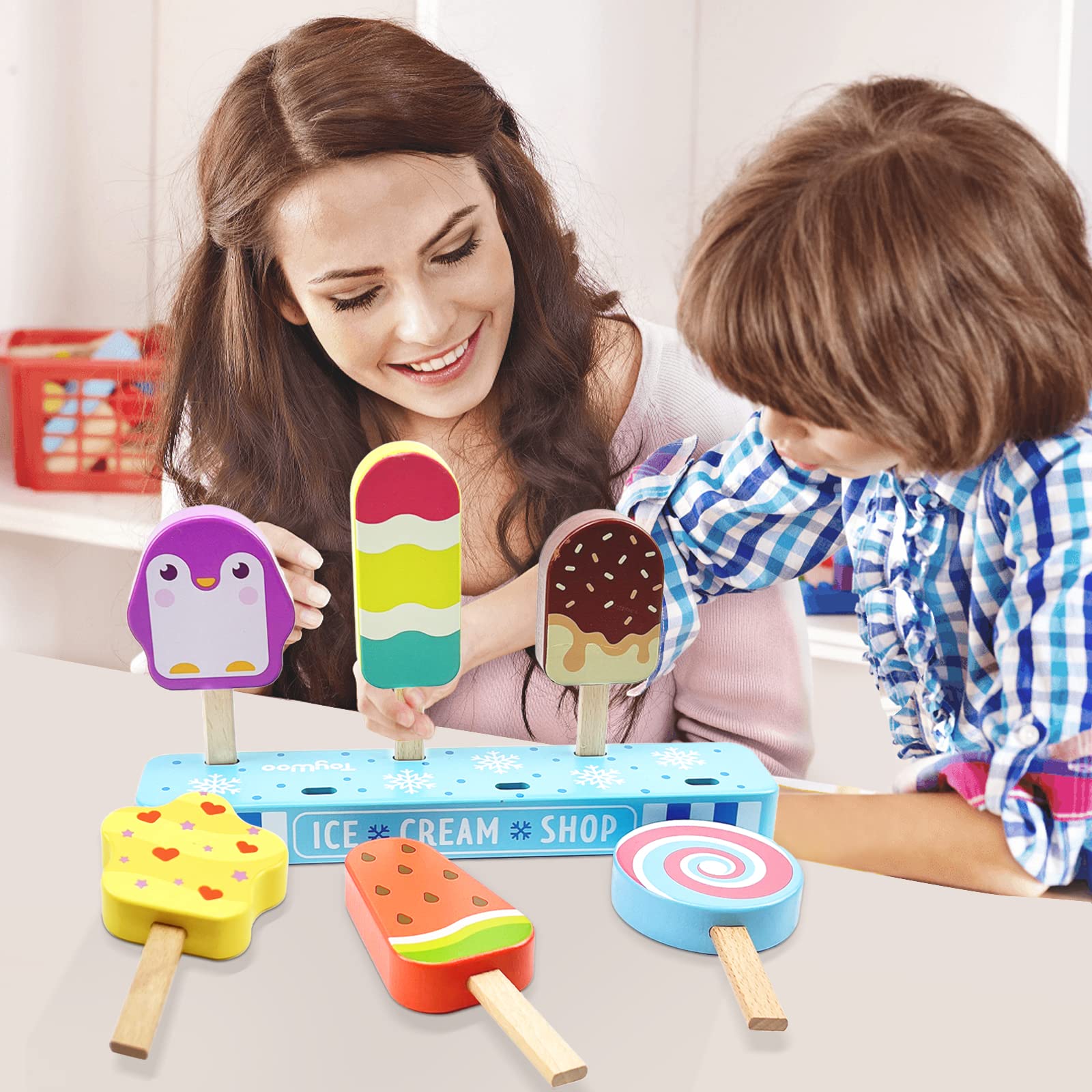 Wooden Ice Cream Toy for Kids, Toddler Pretend Play Food Ice Lolly Pops Set, Preschool Educational Toys and Gifts for Kids Age 3
