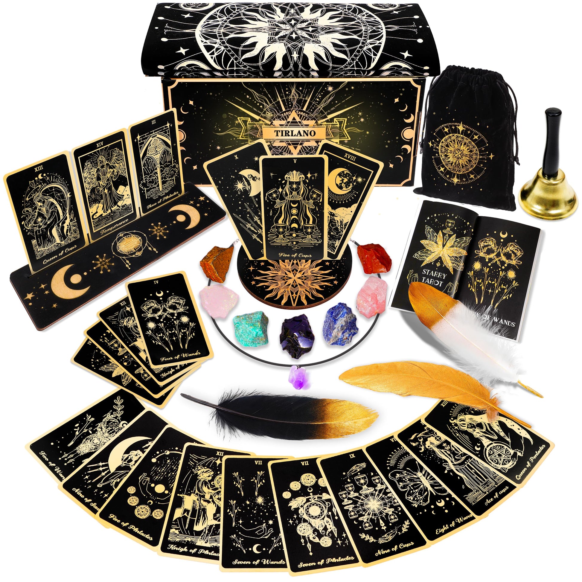 • Q: What accessories are included with the tarot card set? A: The set includes 78 tarot cards, 2 extra commemorative cards, 2 wooden tarot holders, a luxurious velvet tarot bag, 7-color chakra gems, a witch bell, a natural amethyst pendant, a tarot table cloth, 3 feathers, and a detailed guidebook, all beautifully packaged in a solid gift box.
