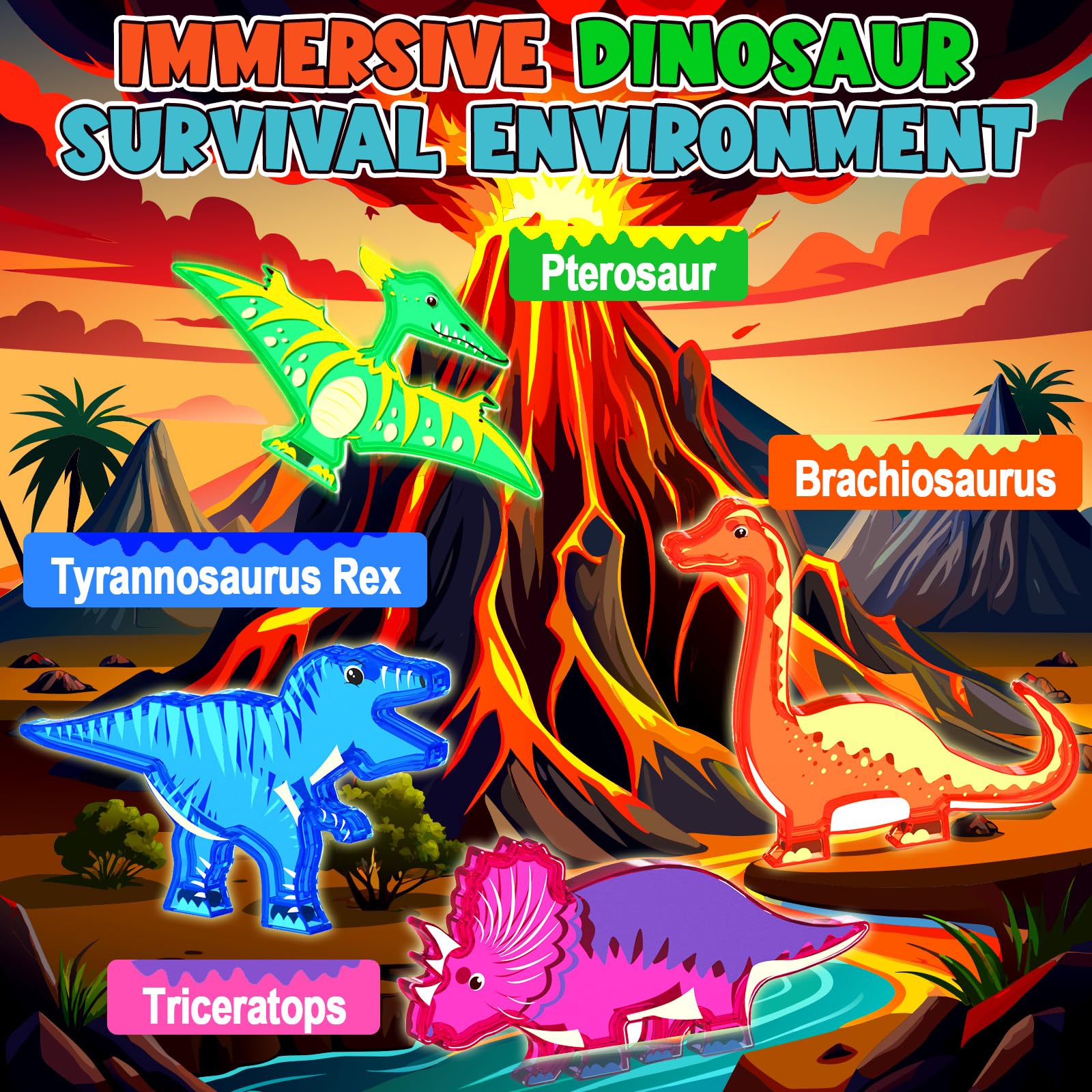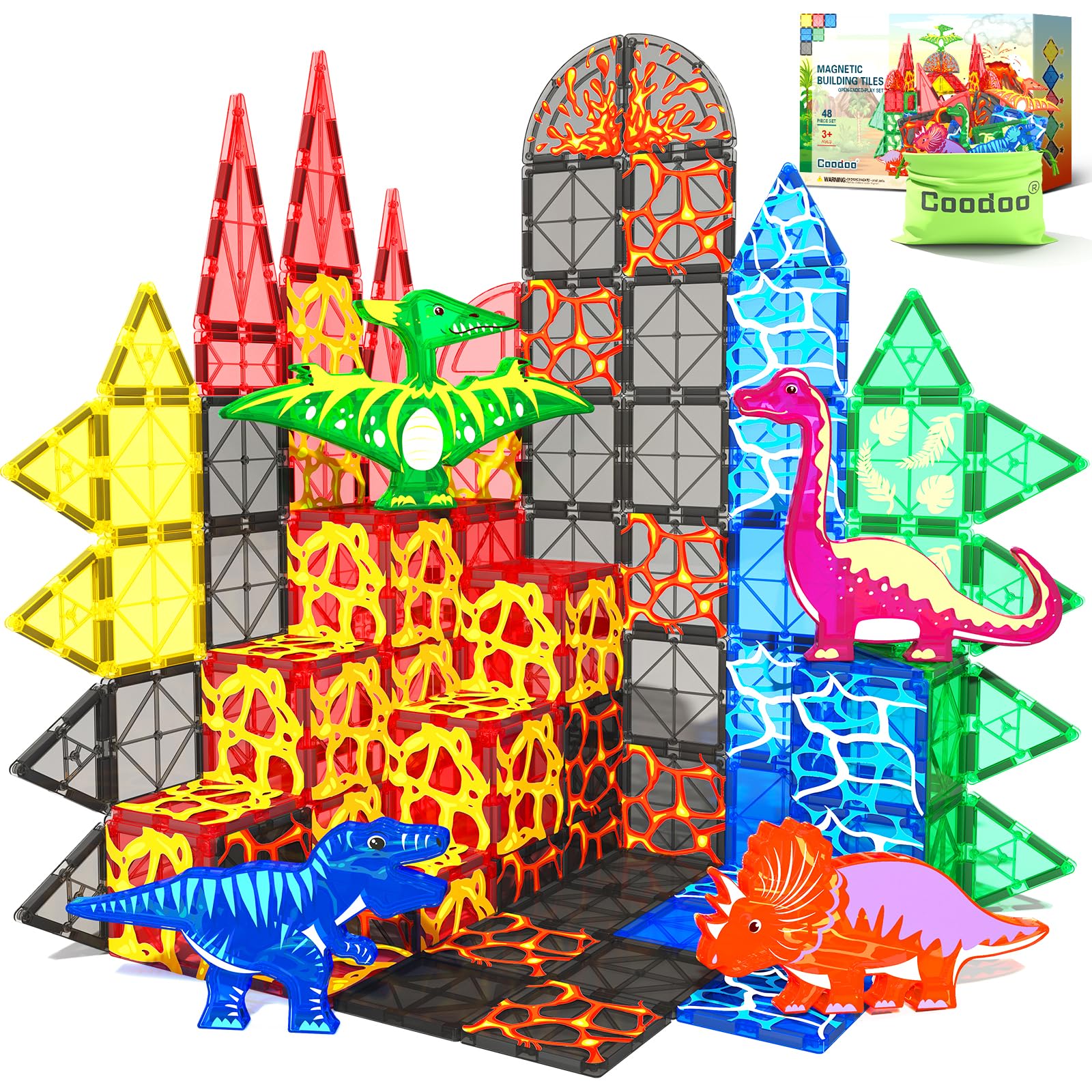 - Lava Dinosaur World Magnetic Tiles Set: Dive into a world of adventure with 48 magnetic tiles, including 4 unique dinosaurs, lava, trees, and water elements. The diverse patterns allow for endless possibilities in building imaginative dinosaur parks.