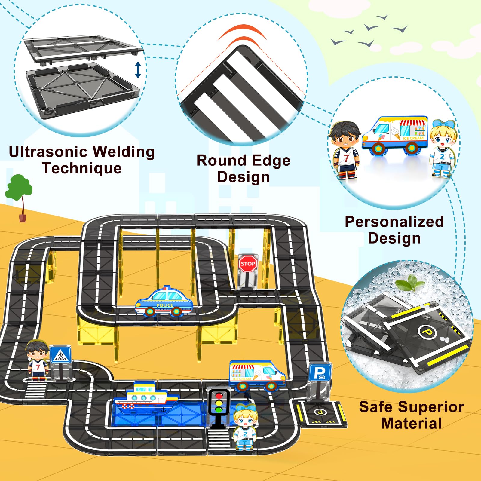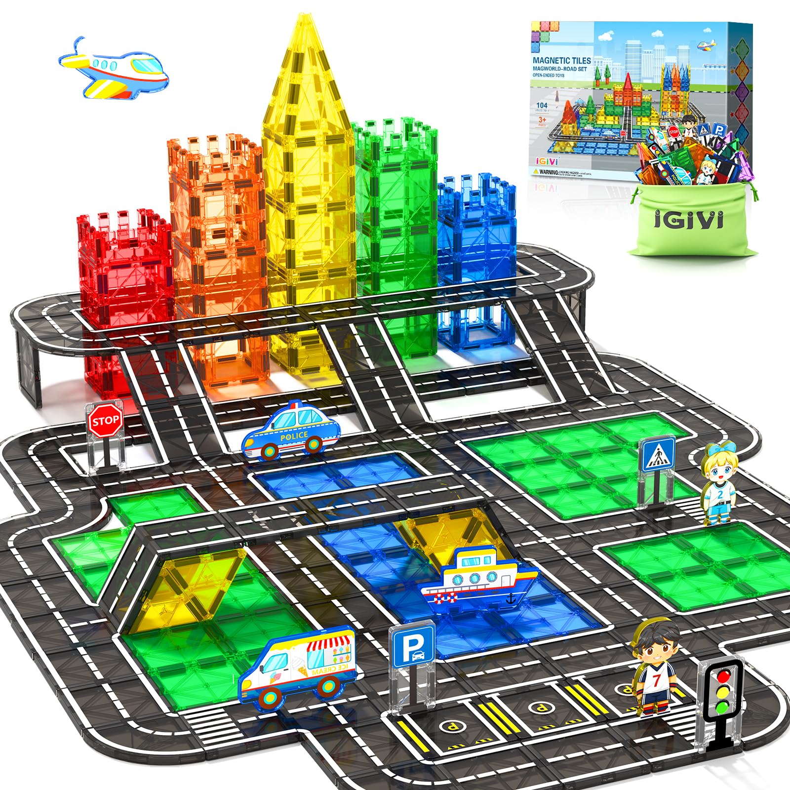IGIVI 104 PCS Magnetic Tiles Road Set - Colorful STEM Building Blocks for Kids 3+, Perfect Christmas & Birthday Gifts for Boys & Girls