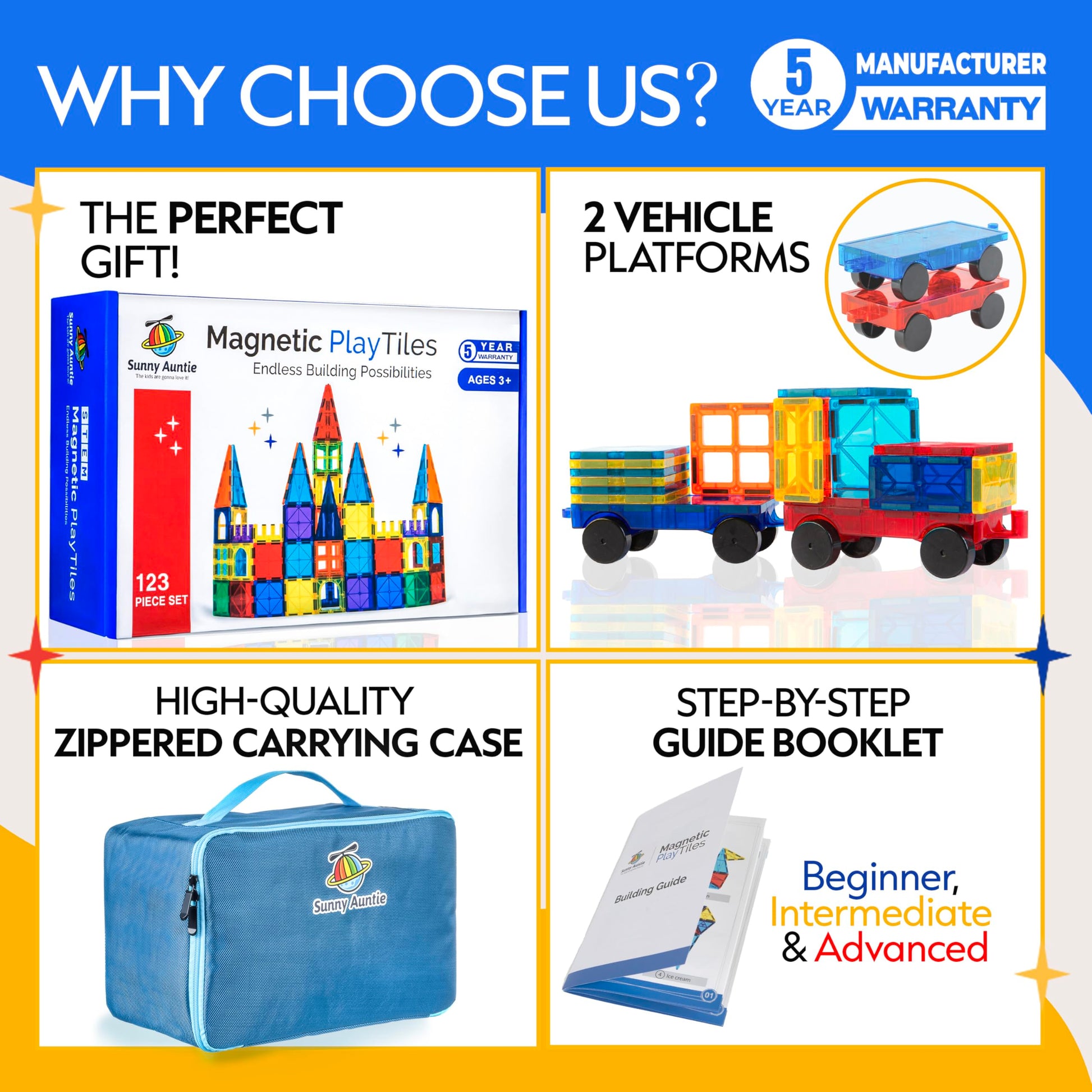 View compareSunny Auntie Magnetic Tiles 123 Pcs + Zippered Case, Magnetic Tiles For Kids Toy For 3 4 5 6 7 8 Year Old Boys & Girls, Great Gift For Kids Aged 3-8