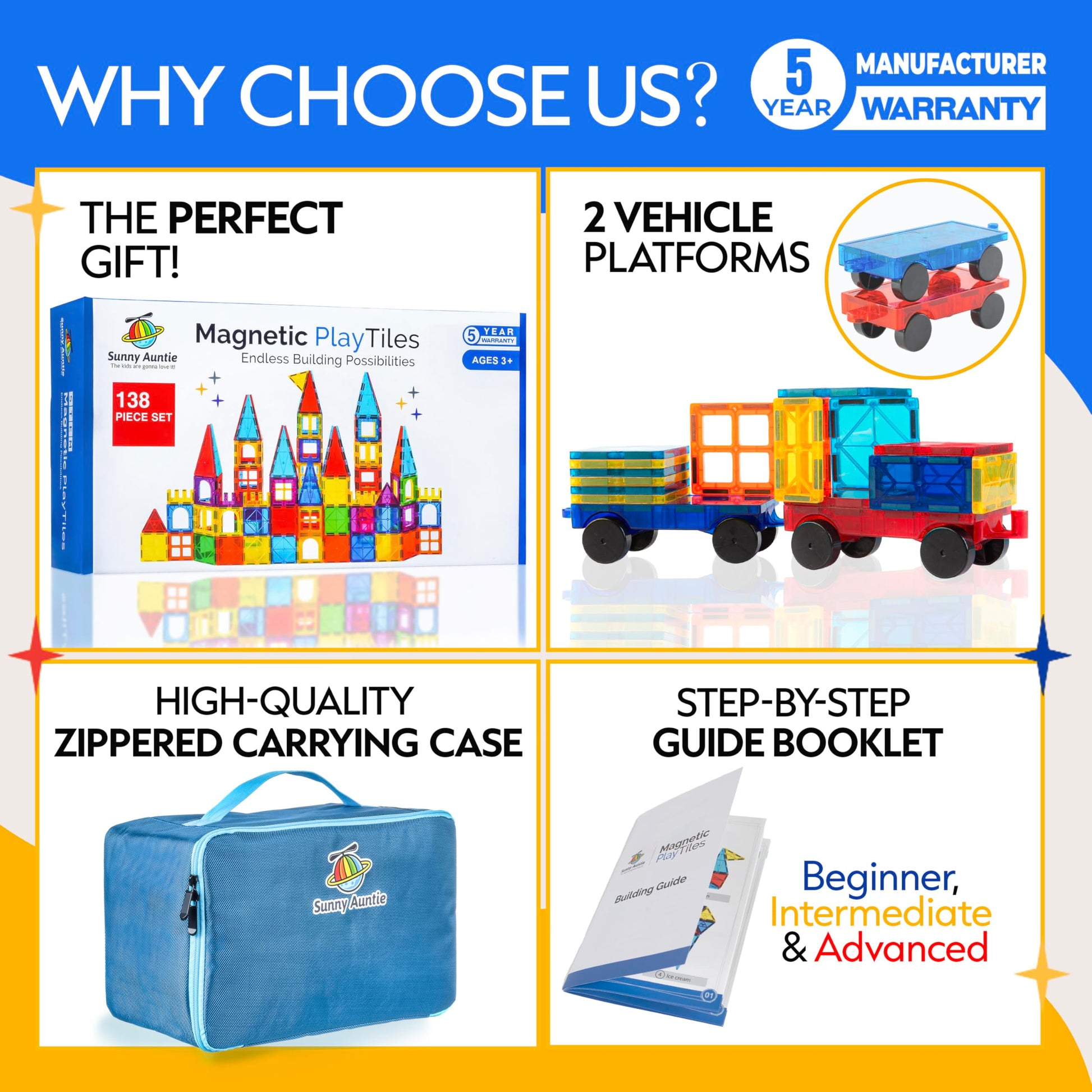 Ultimate Magnetic Tiles Set! This set includes a variety of colorful magnetic tiles, two cars, a carrying case, and a design booklet. It features durable, strong magnets perfect for building large structures. Compatible with brands like Magna-Tiles and Picasso Tiles, it promotes STEM learning, creativity, and problem-solving. Made from safe, non-toxic materials, its perfect for kids aged 3-8 and makes an ideal gift for any occasion. Comes with a 5-year warranty.
