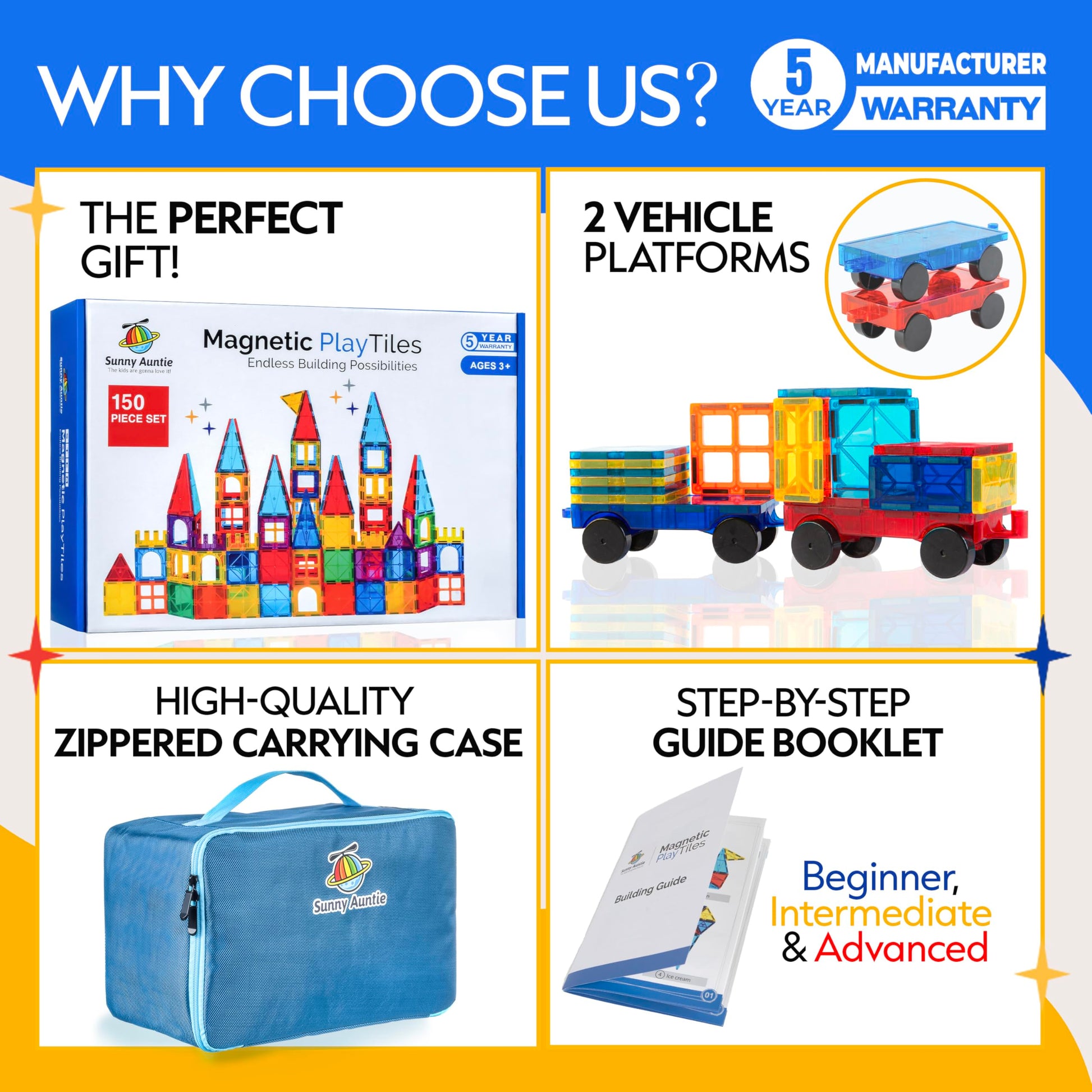 Sunny Auntie Magnetic Tiles 150 Pcs+ Bonus Zippered Case, Magnetic Tiles For Kids Toy For 3 4 5 6 7 8 Year Old Boys & Girls, Great Gift For Kids Aged 3-8, Xl Set