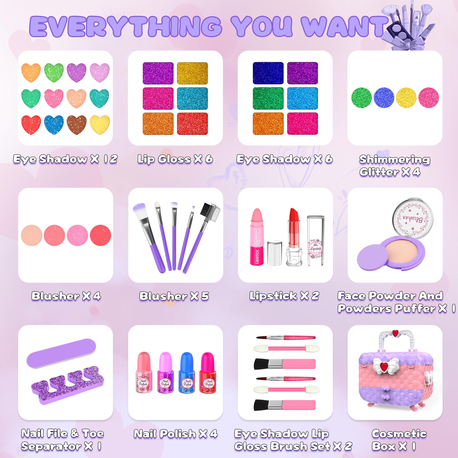 54 Pcs Kids Makeup Kit for Girls, Princess Real Washable Pretend Play Cosmetic Set Toys with Mirror, Birthday Gifts for 3 4 5 6 7 8 9 10+Years Old Girls Kids (Light Purple)
