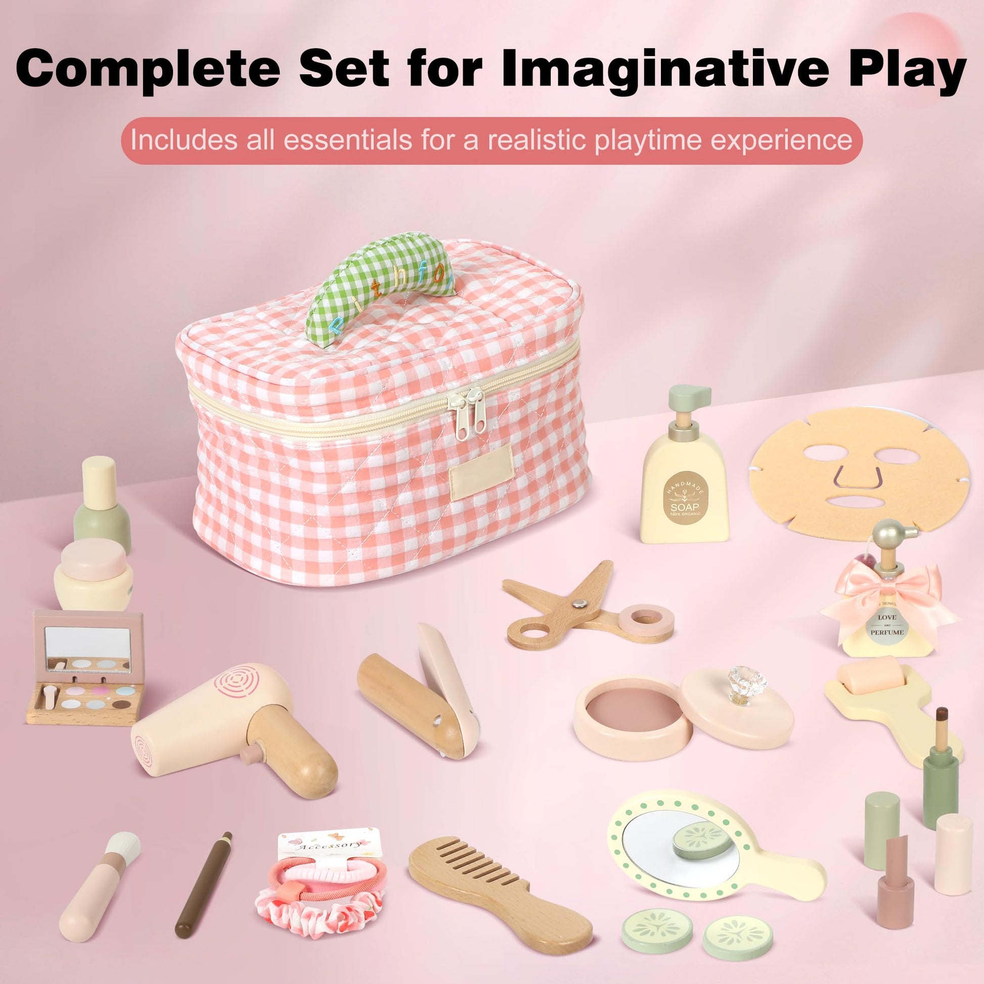 Pithfor Wooden Makeup Toy Set, Pretend Play Makeup Set for Kids Toddlers, Play Beauty Makeup Kit for Girls 3 4 5 6 7 Year Old