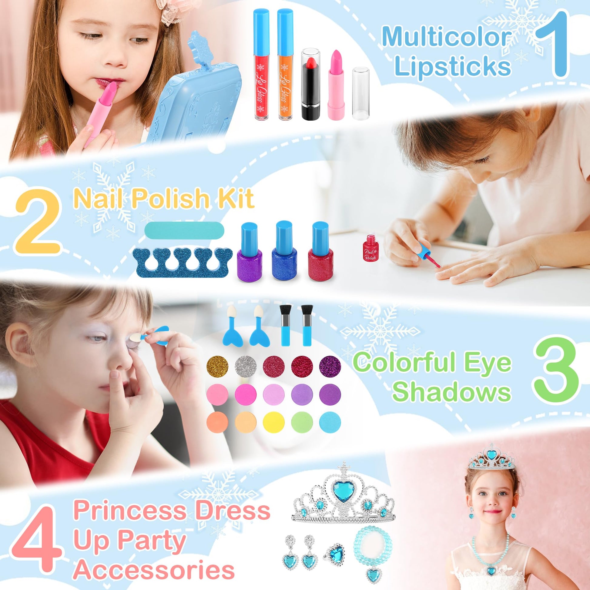 This kid makeup with a LED Makeup Mirror, it comes with 3 color lighting modes(white/warm/natural).Simply touch the button in the middle of the mirror to turn on the light, short press can switch mode.Let your little princess choose a favorite color to unlock the new world of children's cosmetics