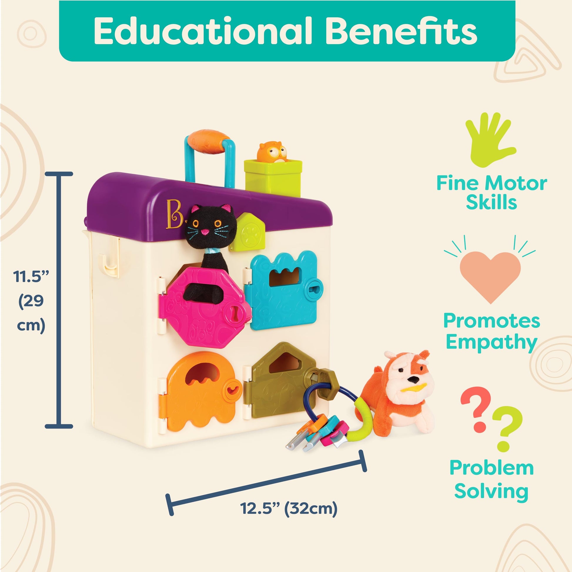 • Q: How does this toy promote learning and development? A: This toy promotes hand-eye coordination and introduces children to colors while encouraging empathy as they learn to care for their stuffed animals and engage in pretend play.