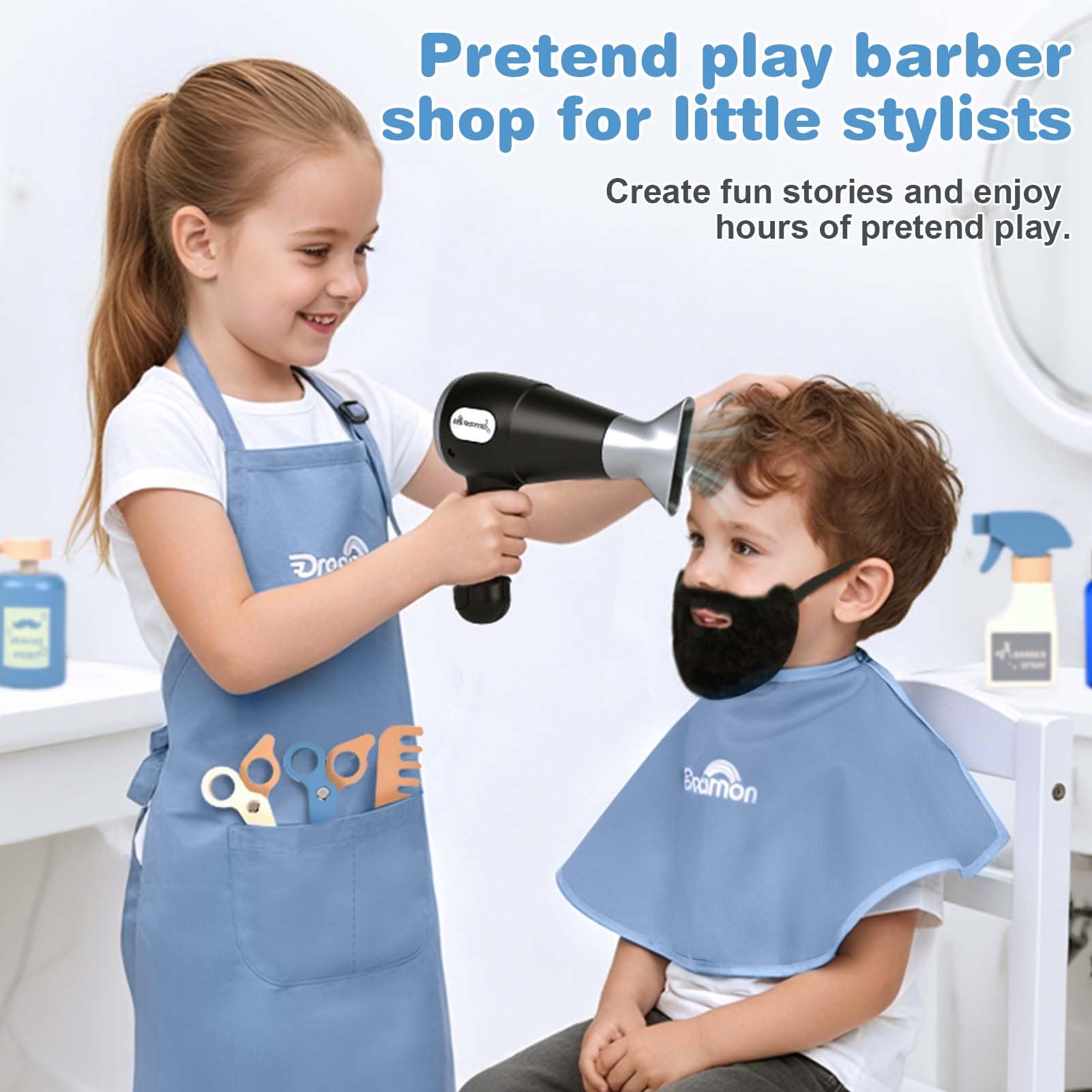 - Q: How do kids play with the Barber Shop Pretend Play Set? A: Kids can use the shaving kit to simulate haircuts and shavings. They can wear the pretend beard and use the accessories to shave, trim, and style just like a real barber.
