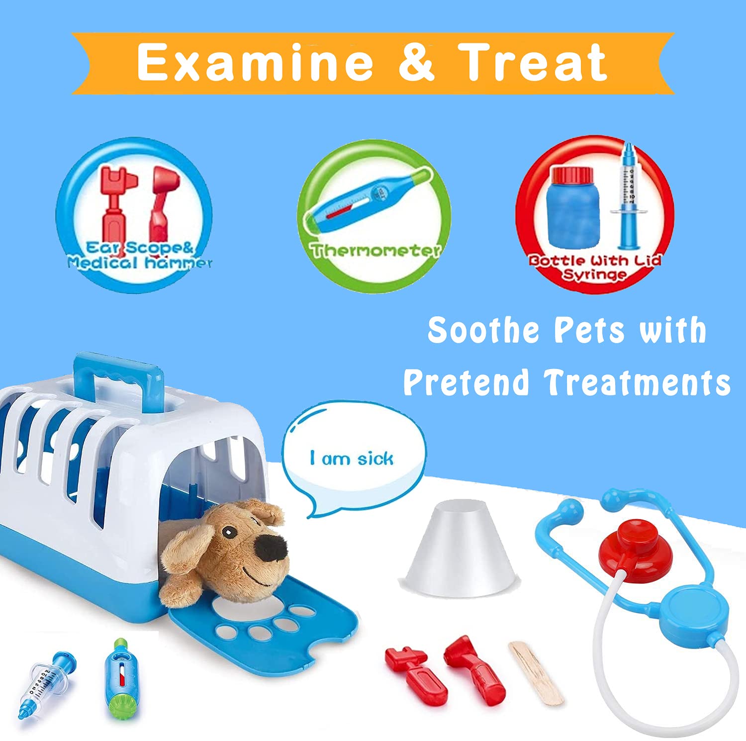 Promote a love for animals, caring for others and imaginative play with this Deluxe Complete Pet Vet Feed & Groom Play Set. This fun kit includes two plush pets (dog and cat) and a variety of cool accessories to play care for them. 34 piece collection includes a stethoscope, thermometer, syringe, ear scope, bandages, neck cone, bottle, food bowls, pretend food and treats, and fun grooming supplies like clippers that vibrate! Durable pet vet carrier makes it easy to store all the veterinary tools and accessories to bring with you anywhere to make a house call. Give young animal lovers everything they need to care for their furry friends! Pretend play pet veterinarian doctor kit helps to cultivate empathy & social skills among children. Encouraging imaginative play and responsible pet ownership, this pretend play set makes an exceptional gift for kids ages 3 to 5 years.