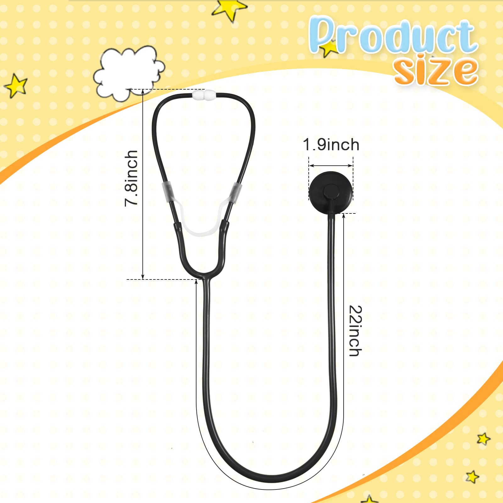 Features: Educational meaning: Listening to the stethoscope toy is a nice way for the little ones to learn how the heart works, letting them have a basic understanding of the profession of doctor and nurse, reducing the fear of doctor and nurses and increasing the sense of admiration for doctors and nurses. Lovely gift choice: You can give the stethoscope accessories for the little ones, they will be delighted to receive such lovely and interesting toys, allowing them to enjoy the fun of cosplay on a themed party, expressing your care. Specifications: Material: PVC Color: black Size: Total length: approx. 29 inches Tubing: approx. 22 inch in length Package includes: 30 x Stethoscope toys Notes: Manual measurement, please allow slight errors on size. The color may exist a slight difference due to different screen displays. Winding risk may exist, please keep away from little kids. These products are only suitable for kids over 12 years old.