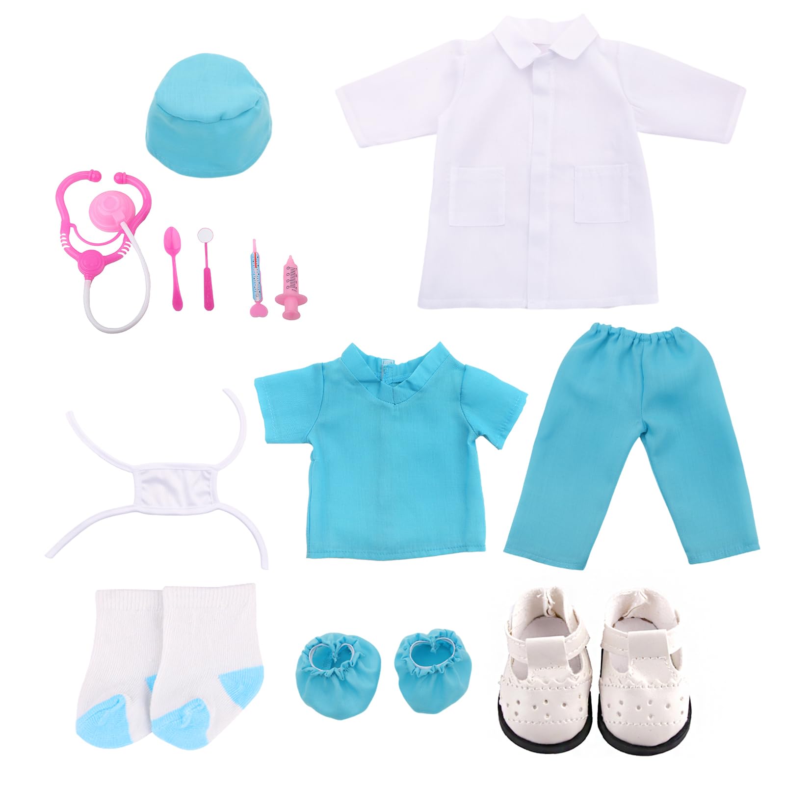 Why choose MSYO's doll accessories products? MSYO is a brand that specializes in dolls and doll accessories. Our doll products are popular due to their excellent quality, exquisite design, wide variety, and versatile applications. Which doll accessories are included in this doll doctor playset? A total of 13 pcs doll doctor uniform and medical tool kit. Complete doctor uniform including doll white lab coat, hat, mask, scrubs (top and pants), shoes and shoe covers, socks. What materials are these 18 inch doll doctor playset made of? The doll doctor uniform is made of a cotton blend, while the doll doctor kit is mainly made of ABS plastic. These doll accessories are crafted from non-toxic and odorless materials that are skin-friendly, durable, and can be used repeatedly for an extended period. You can confidently allow your child to play with them. Which dolls are these doll clothes for? This set of doll clothes and accessories are designed for 18 inch girl dolls, it can perfectly fit all 18 inch girl dolls such as American doll, OG dolls, glitter dolls and more. Purchase Reminder THE DOLL SHOWN IN THE PICTURES ARE NOT INCLUDED! This item only includes doll doctor role-playing costumes and toy medical tools.