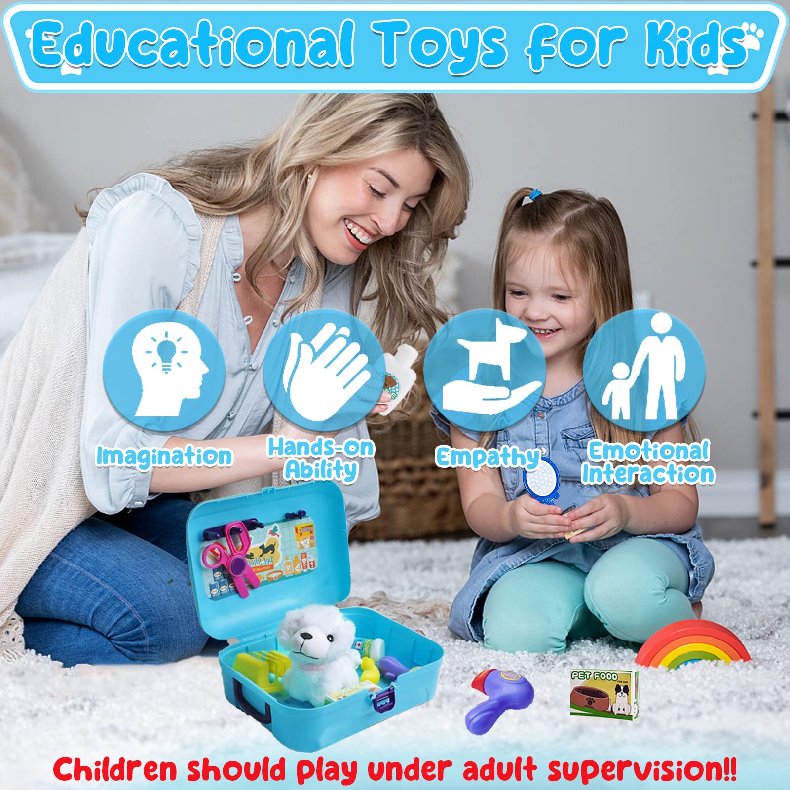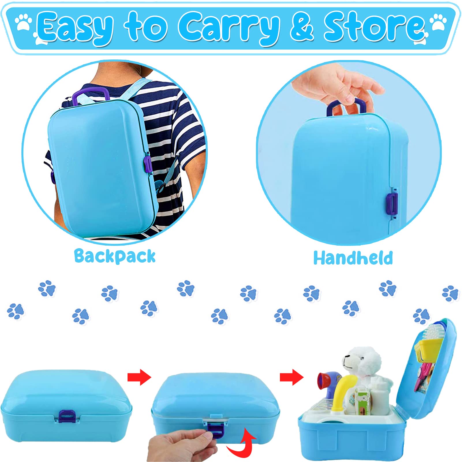 Complete Pet Care Kit Come with 16 pcs pet care accessories, this pet care playset can meet the role-playing needs of children who want to keep pets. This kids doctor kit includes a plush dog, pet carrier, dog treats, pet food, plastic scissors, hair dryer, and so on. With these complete pet care accessories, your little one will experience a variety of pet care activities, such as feeding, grooming, bathing, and treating their plush dogs. Specially Designed for Kids These pet play sets are made from premium ABS materials, not easy to break, and durable enough for long time use. All pretend play toys in this set feature a smooth and rounded edges design to keep kids hands from being scratched and the plush dog is smooth and soft to the touch. In addition, this pet care playset has a small size that fits kids small hands, making it easy for children to grasp. The pet case size is the largest, but only 25cm X 20cm (L*W). There are two ways to use this pet case: backpack-styles and handheld. It is convenient to store and carry pet care accessories so that children can take care of their beloved plush friends anytime, anywhere. Educational Pet Care Set Our pretend play for a vivid pretend play, allowing children to take care of the puppy in all aspects. Kids would love it. It is beneficial for developing patience and love in children who intend to have pets in the future. This pet care play set helps kids develop empathy and learn responsibility during the doctor role play game. By caring for the puppy friend, children can practice caring for others and develop pet care skills while they play. Also, your child's imagination and hands-on ability can be enhanced by using a variety of tools. It is a perfect gift for kids over 3 years old. Great for birthdays, Christmas, New Year, holidays, and other child gift-giving occasions.