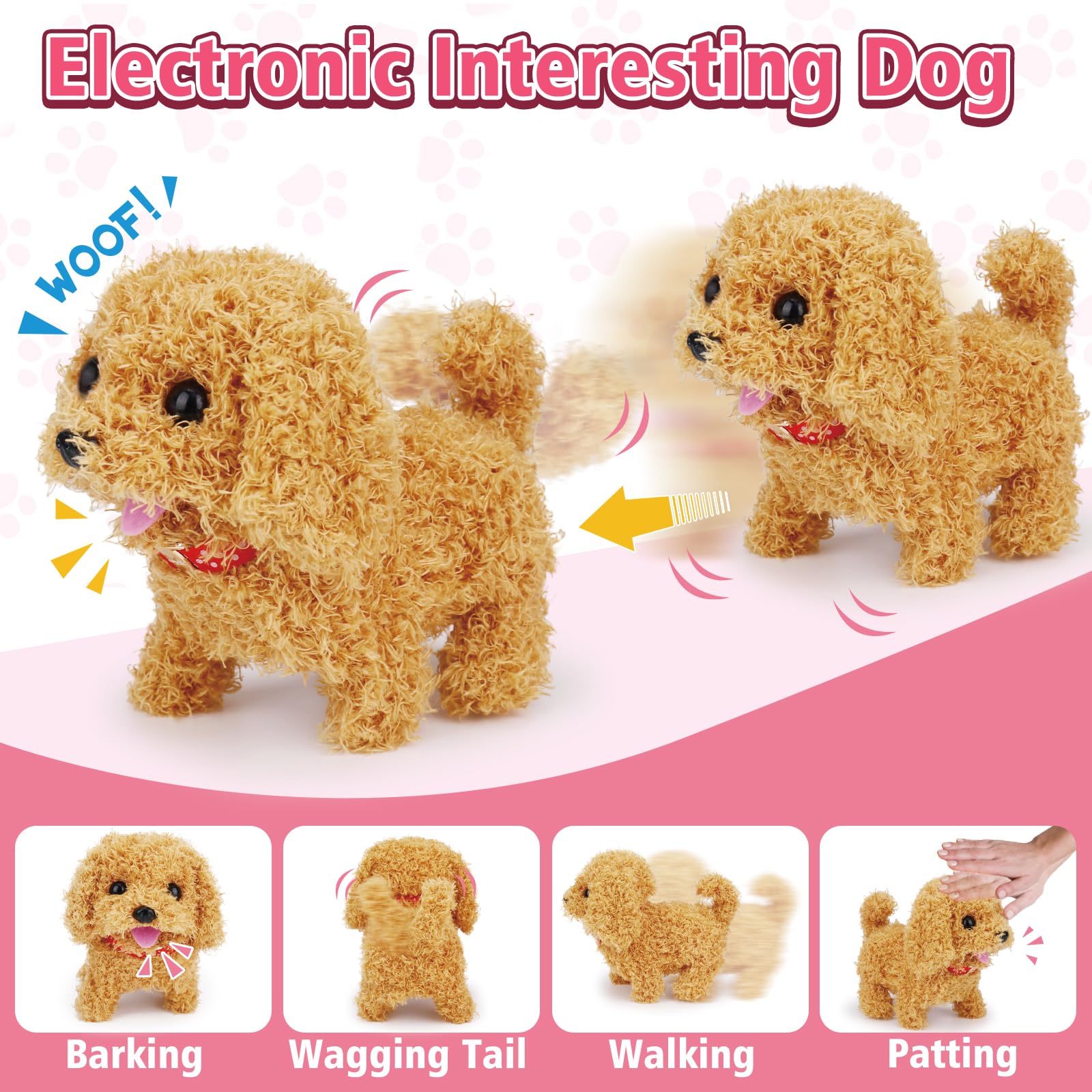 - Q: What features does the interactive dog toy have? A: This interactive dog toy features realistic movements such as walking, barking, and tail wagging. It also responds to touch, making sounds when patted on the head, which enhances the play experience for kids.