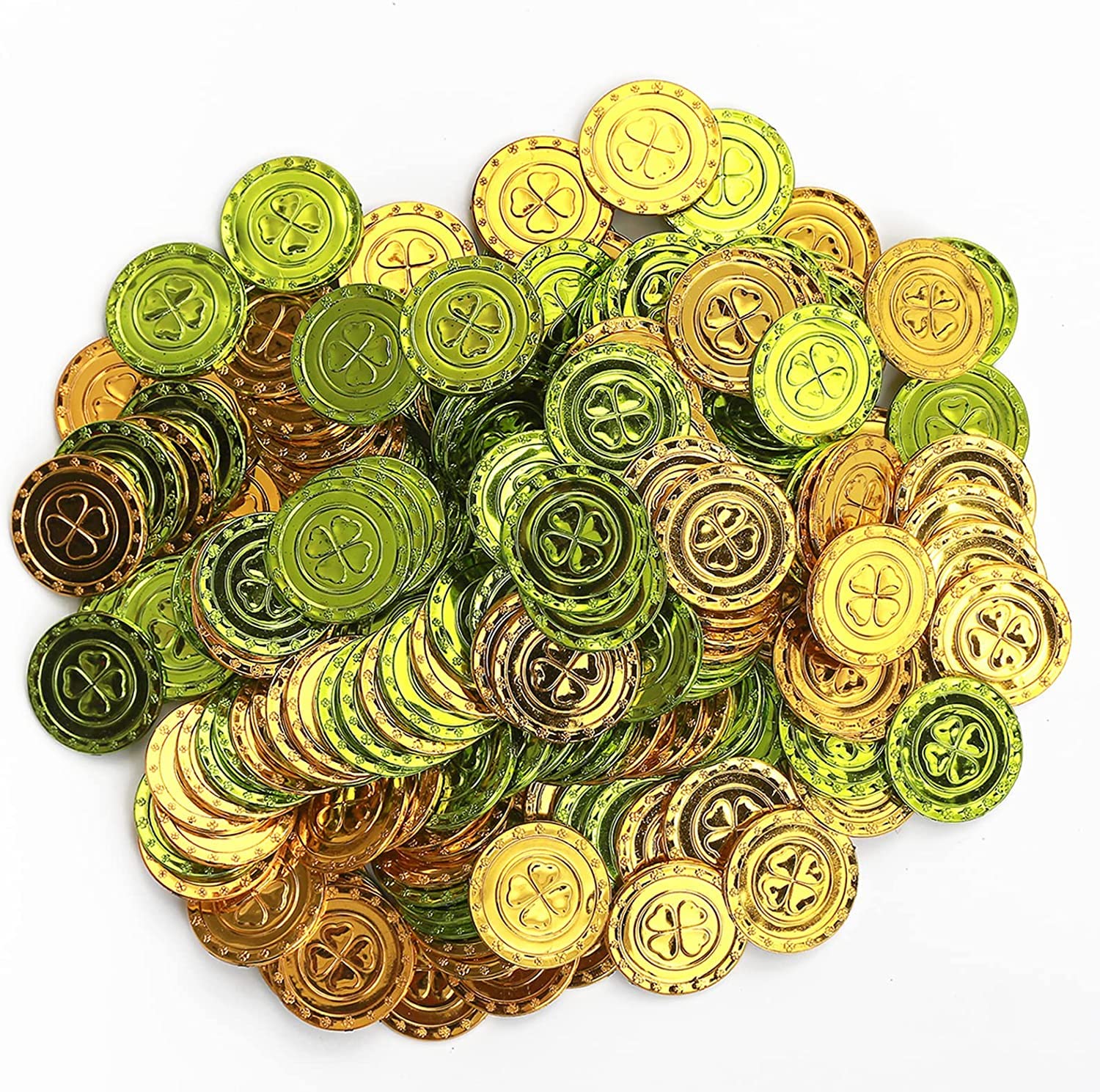 100pcs St. Patrick's Day 4 Leaf Clover Coins, Plastic Green and Gold Lucky Coins for Party Supplies St. Patrick's Day Decoration