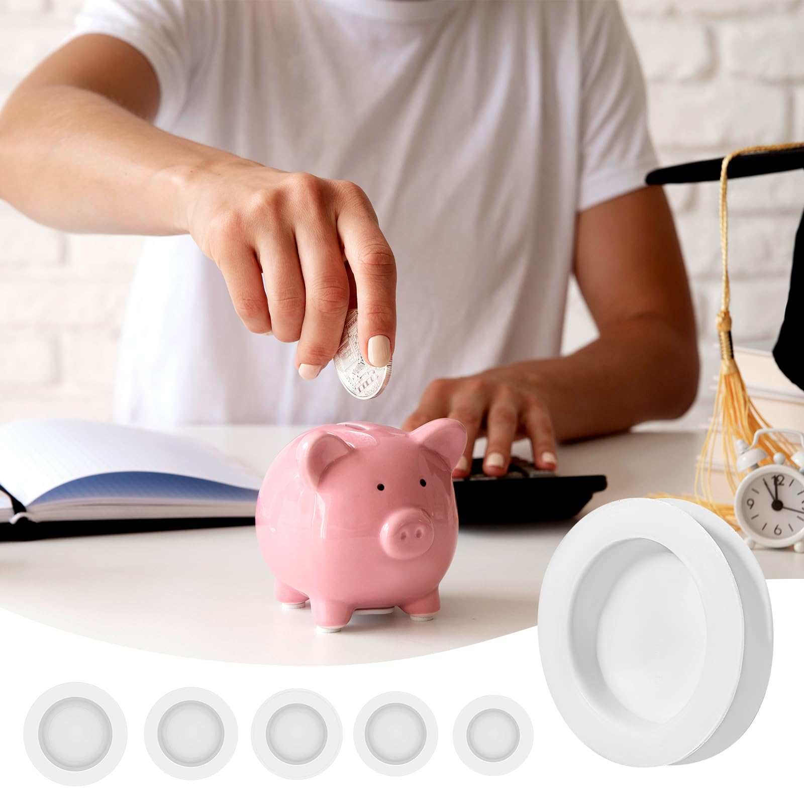 specificationProduct name: White piggy bank stopper piggy bank plugSize: 5 sizes, outer diameter 37mm/1.46inch; inner diameter 26mm/1inch; outer diameter 38mm/1.5inch; inner diameter 30mm/1.2inch; outer diameter 42mm/1.65inch; inner diameter 30mm/1.2inch; outer diameter 42mm/1.65inch; inner diameter 32mm/1.26inch; outer diameter 50mm/2inch; inner diameter 38mm/1.5inchColor: WhiteMaterial: PlasticWeight: 83g Packing list:20pcs white rubber piggy bank stopper cover round piggy bank stopper