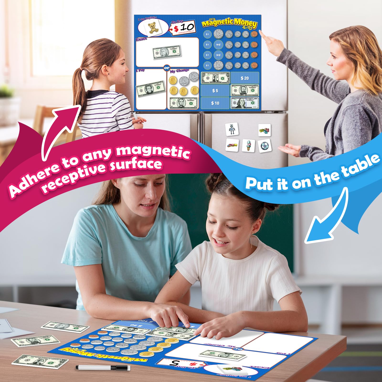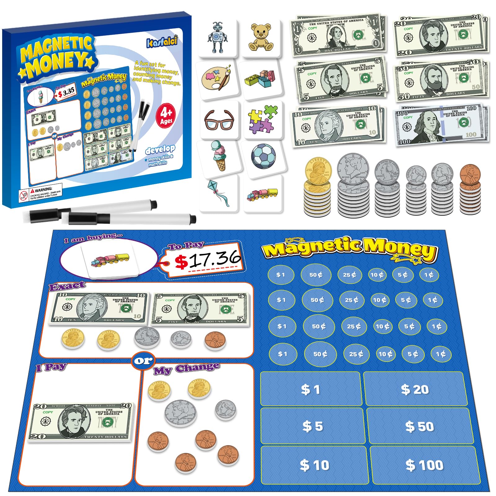 - Q: How can the magnetic money help my child learn about math? A: This magnetic money set allows children to practice counting, adding, and making change through interactive role-playing games. Kids can engage in pretend play where they buy items and calculate prices, enhancing their math skills in a practical context.