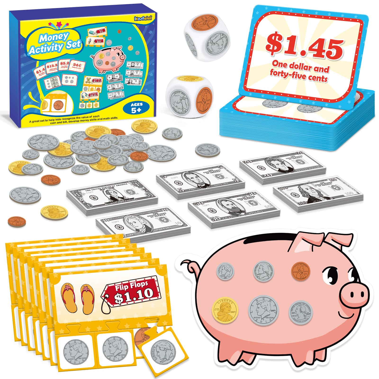 - Q: What is included in the Kasfalci Money Activity Set? A: The Kasfalci Money Activity Set includes 60 play bills, 60 play coins, 24 money puzzle cards, 12 double-sided price tags, 1 piggy bank card, 2 dice, and a guide to help facilitate learning.