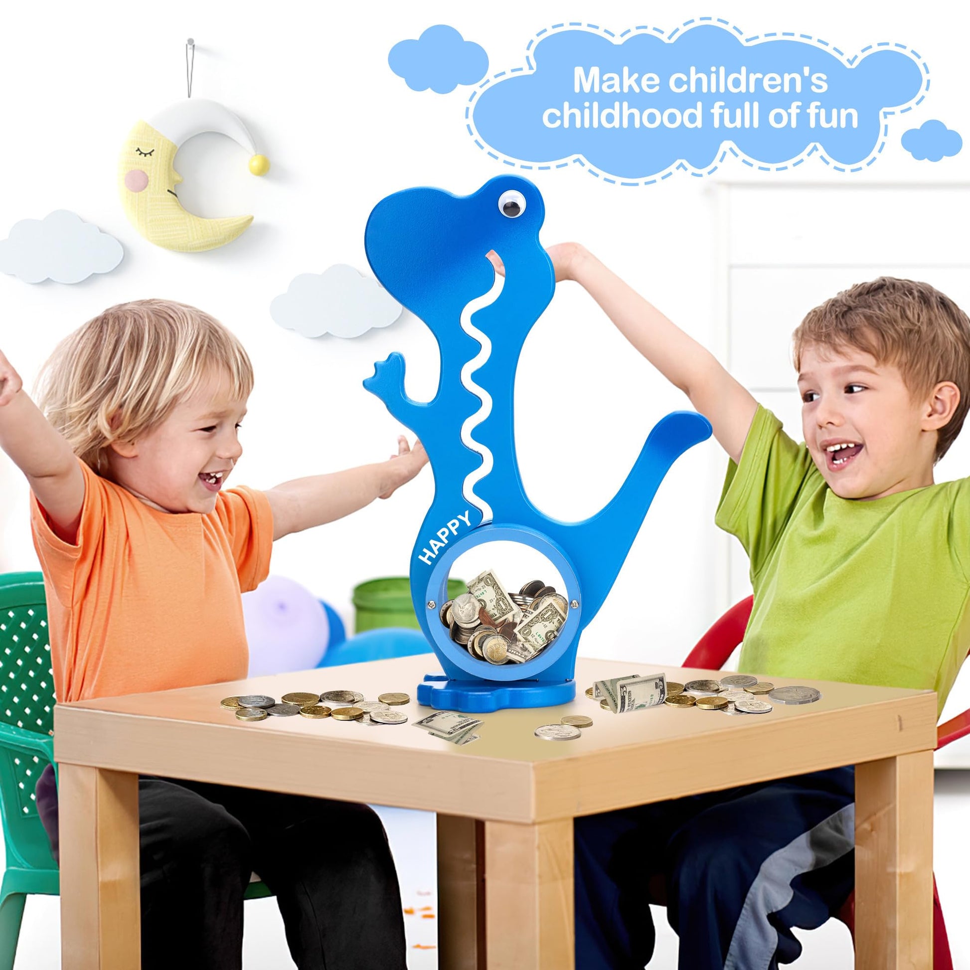 - Q: How does the coin operation work in this piggy bank? A: Children simply feed a coin into the dinosaur's mouth, where it travels along a curved track and is 'eaten' into the dinosaur's transparent belly, providing an engaging and fun way to save money.