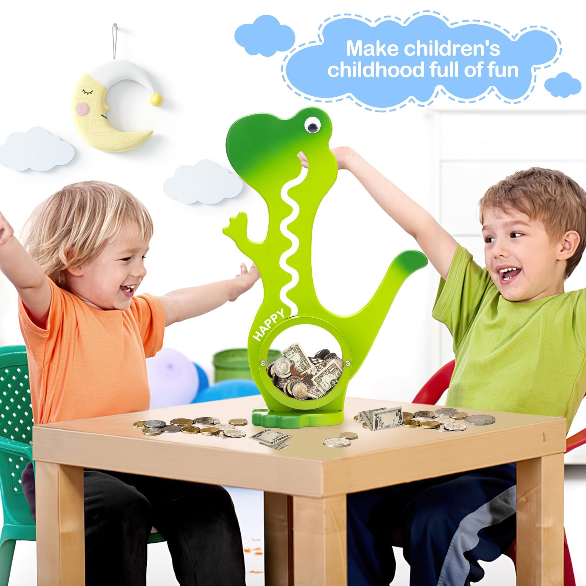 Aorcmitn Wooden Dinosaur Piggy Bank Boalord For Boys Kids Girls Clear Big Belly Animal Coin Bank For Toddler Real Money Toy(Dino-Green)