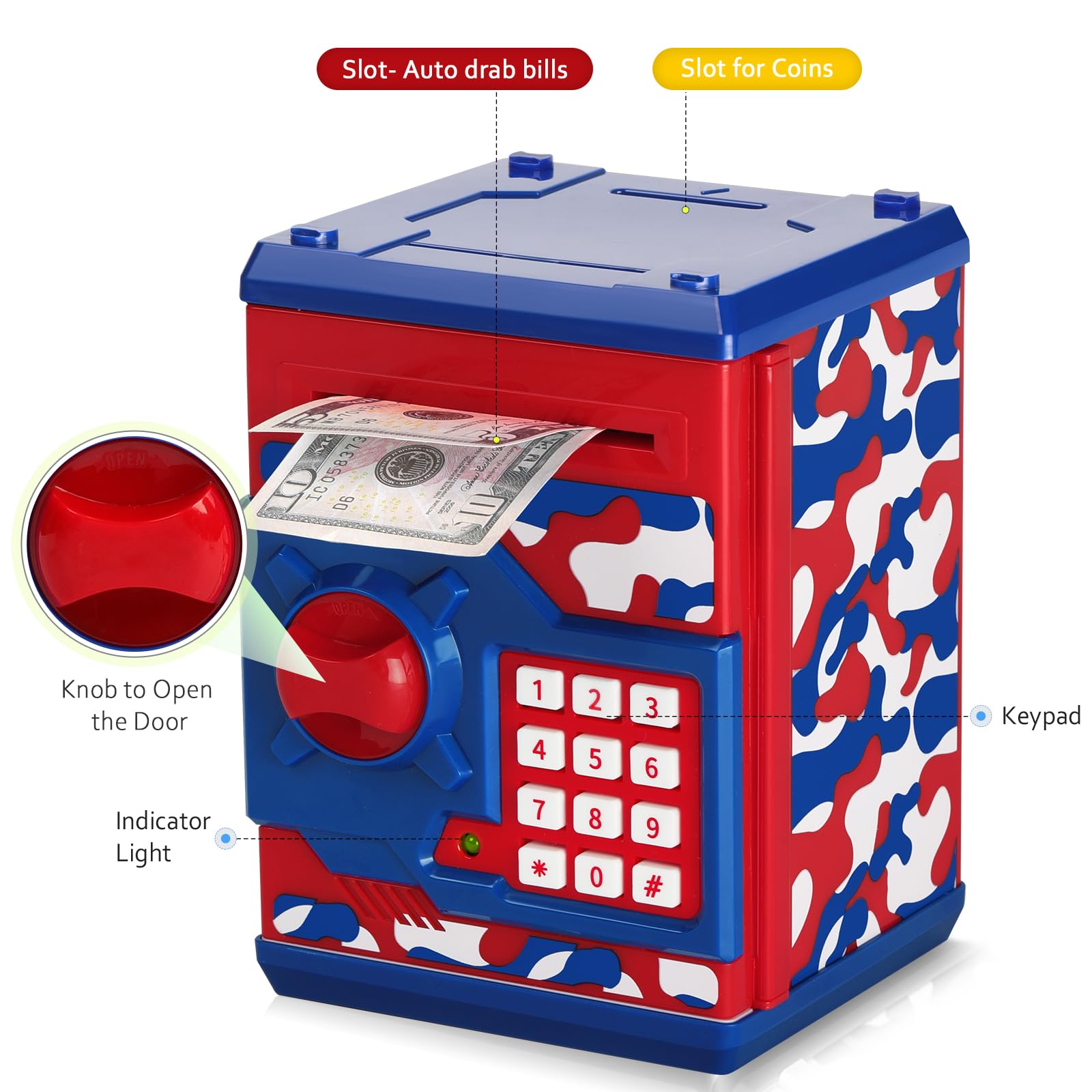 ATM Piggy Bank for Boys and Girls - The Vcertcpl Mini ATM Coin Bank is the perfect solution for teaching children the value of saving money. This uniquely designed money-saving box features a secure password protection system, ensuring that kids can safely store their coins and bills. With its vibrant Camouflage Red Blue color, it captivates children's attention while blending seamlessly into any room décor.