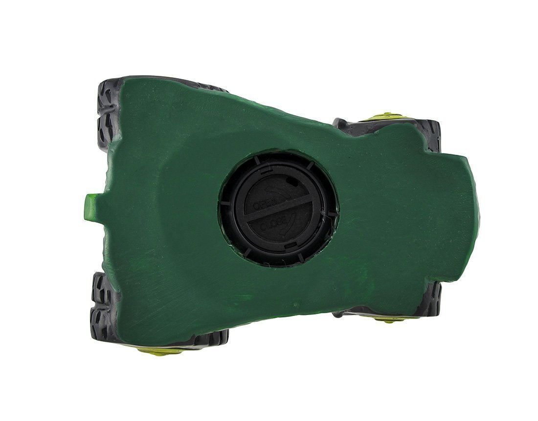 This John Deere bank features a tractor in classic John Deere green color sitting in grass. The slot for coins is on top of the tractor's cab. A fun piece for your child's room or display piece to compliment your tractor collection! Made of durable poly-resin material.