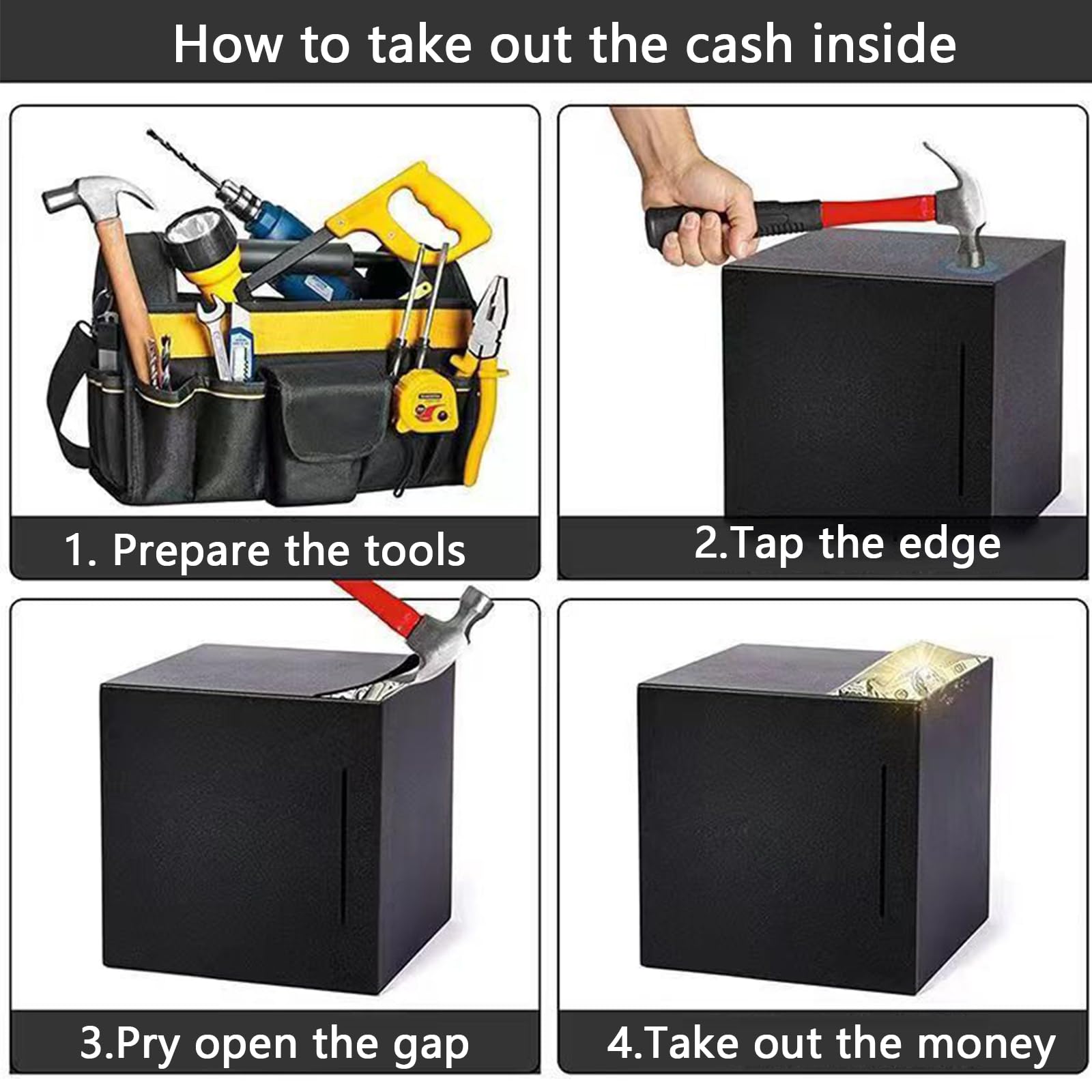Features: 1. Challenge savings box develops proper spending habits and can help you spend your money on important occasions. 2. The four-sided closed design makes it take a certain amount of time for you to get it open, and this design can make the less determined give up the behavior of taking money from the savings box. 3. Deposit a small amount of change each day and wait until you complete the $3,000 savings challenge and you'll feel a sense of accomplishment like never before! Specification: Material: Stainless Weight: 310g/0.68pound Size: 12x12x12cm/4.7X4.7X4.7inch Package Includes: 1 x Money Saving Box