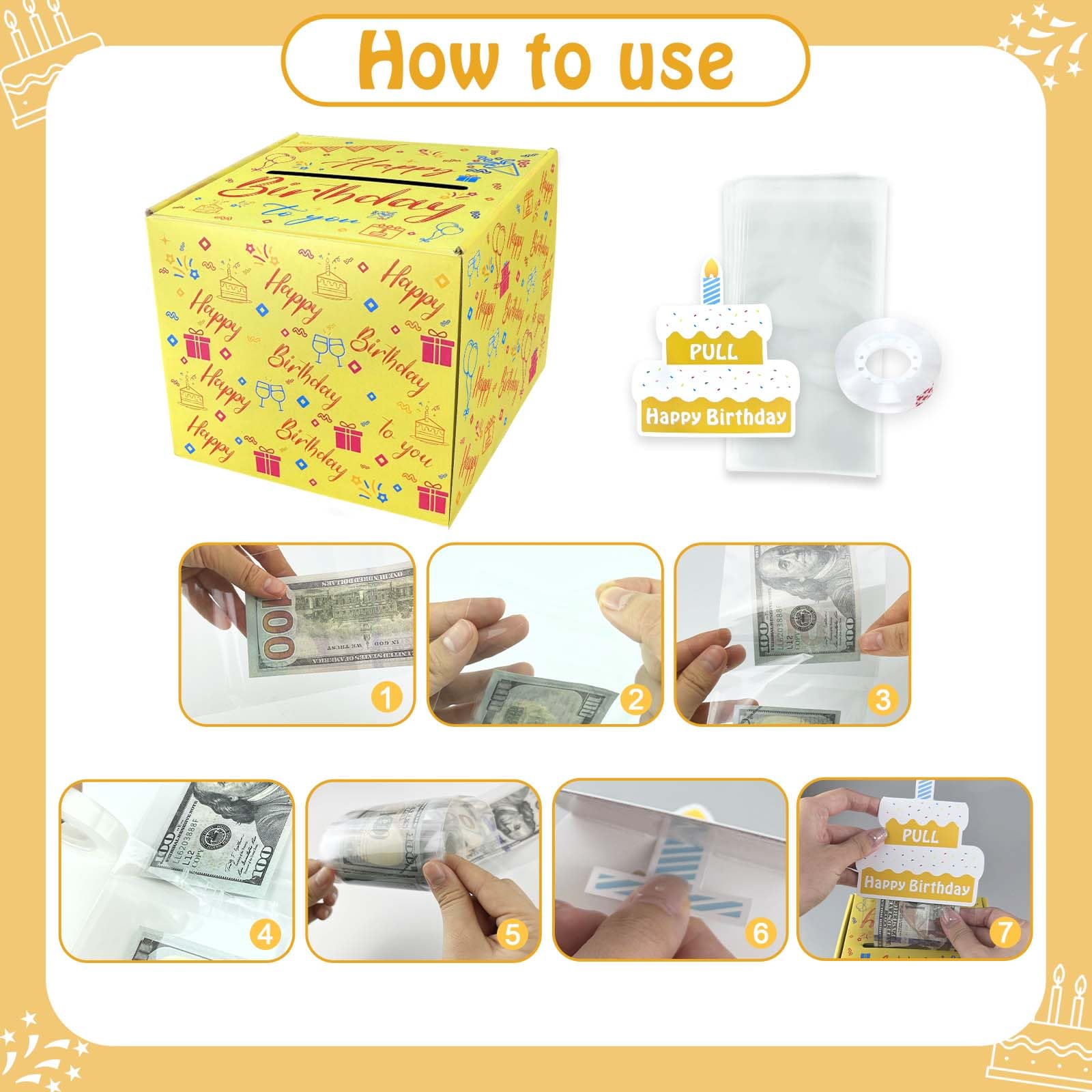 This includes a Happy Birthday Day saving box, a birthday cake with candle card, a roll of self-adhesive tape and 30 plastic bags.Imagine your friend face when he opens the box. It will be an unforgettable moment. Tape your money together with some plastic bags that are similar in width to dollar bills so that they fit between the bills. Then roll up the money, put it in the box, use the laca tag through the gap, and the money will flow out as you pull it. I can already imagine your friends/familys surprise when they open the gift.