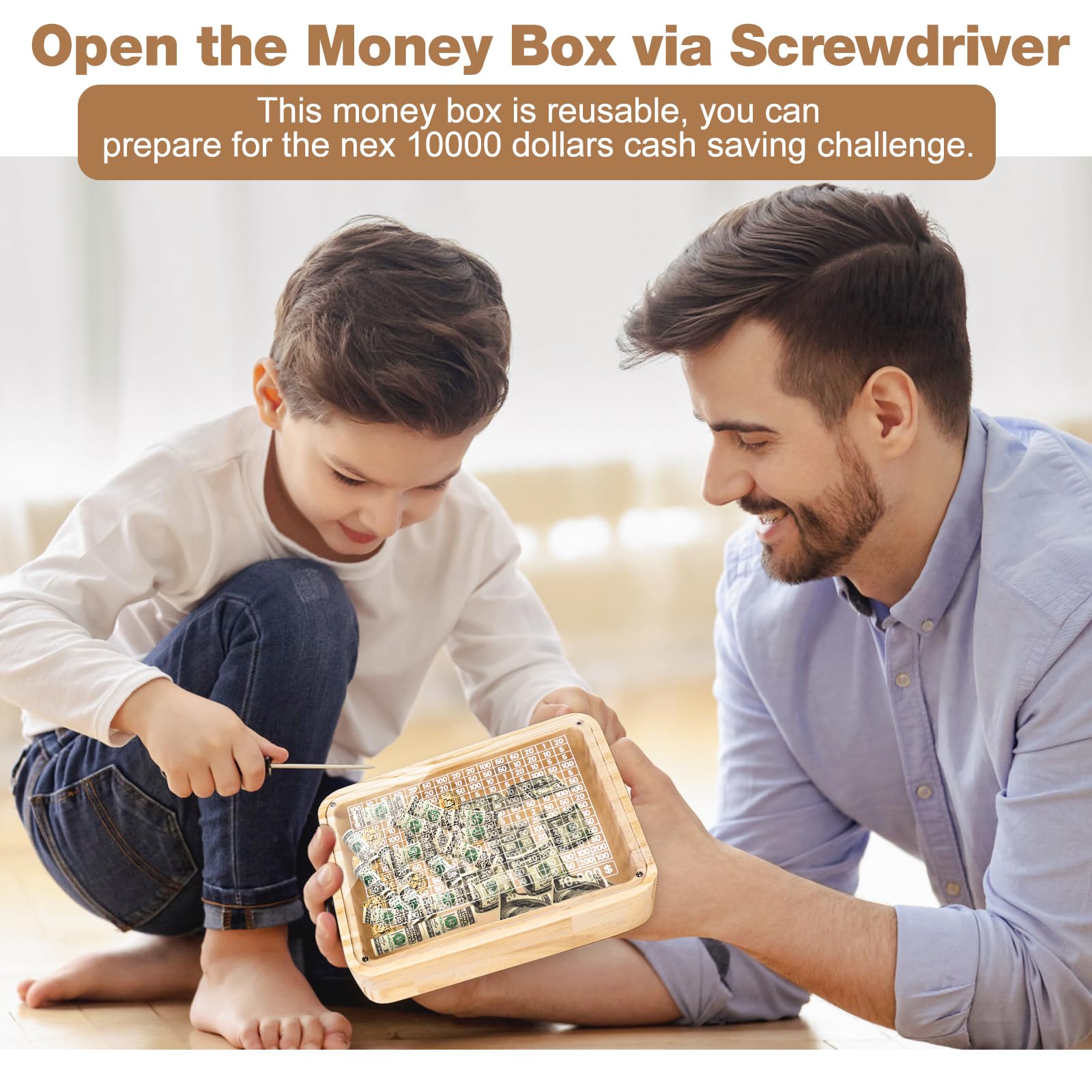 Homgaty Wooden Money Box Money Bank, Clear Countdown Money Saving Box With 10000 Dollars Target, Money Box With Money Target And Numbers To Check For Adults Kids Boys Girls
