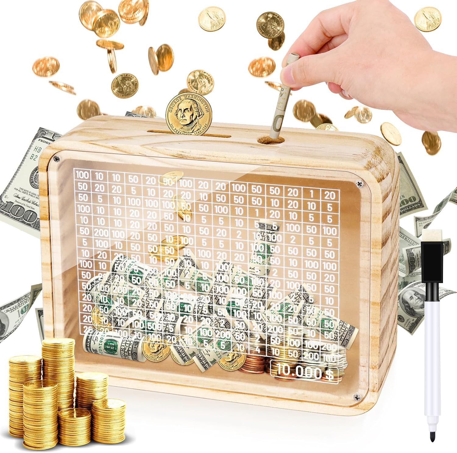 View compareHomgaty Wooden Money Box Money Bank, Clear Countdown Money Saving Box With 10000 Dollars Target, Money Box With Money Target And Numbers To Check For Adults Kids Boys Girls