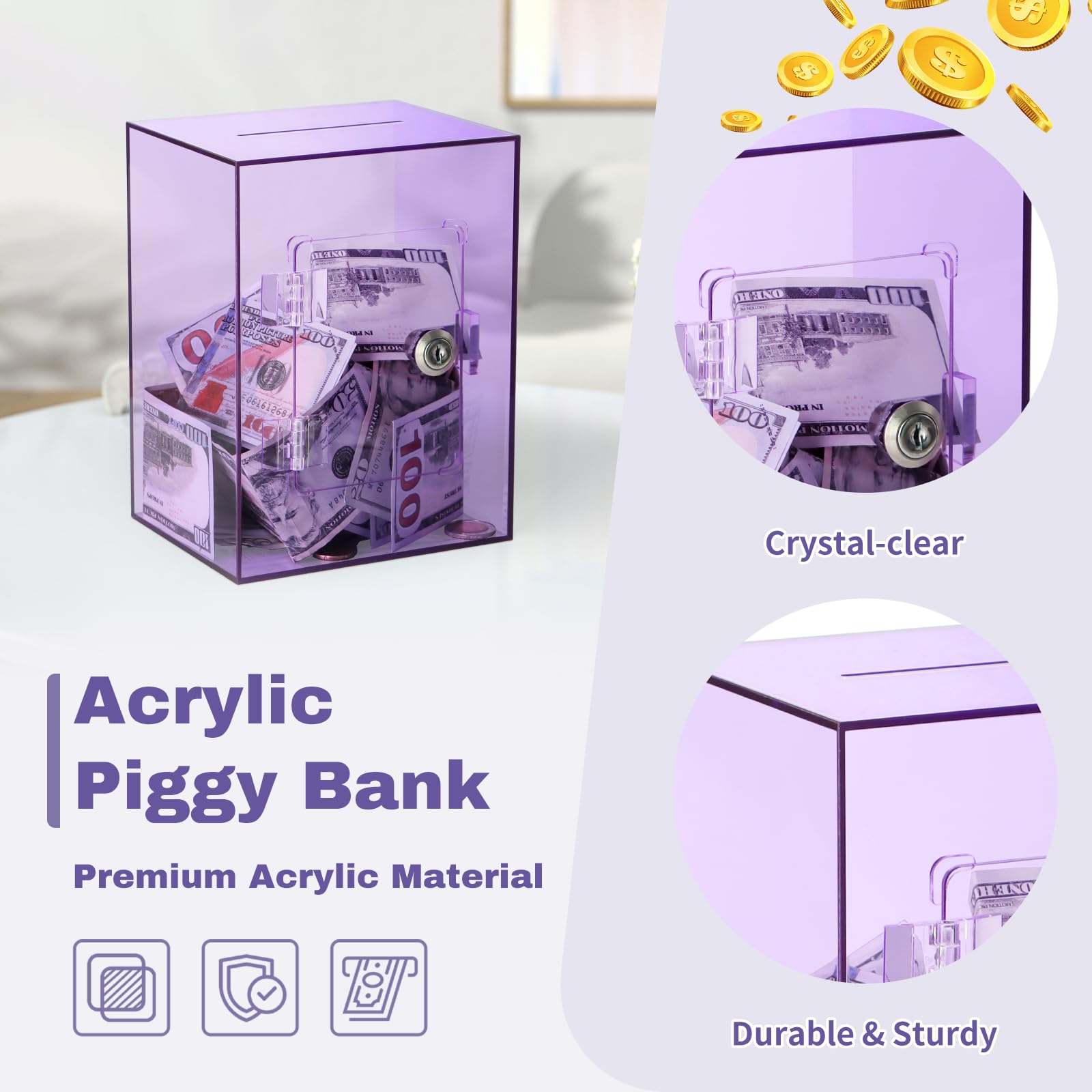 Transparent Visual Design: Experience the excitement of watching your savings grow with our clear acrylic piggy bank. This innovative design not only transforms every coin and bill into a visible celebration of your savings progress and keeps you motivated, but also offers a perfect canvas for easy DIY customization | Secure Locking Mechanism: Our clear savings box features an innovative locking design that keeps your savings safe and secure. The clear bank with lock comes with two keys for easy access without breaking the bank. The design is child-friendly, allowing kids to check their savings easily, while ensuring the bank remains reusable and secure | Premium Acrylic Material: Made from thick, high-quality acrylic with a solid rectangular design, this purple money-saving box with lock offers exceptional durability and withstands daily use. The crystal-clear acrylic and sleek, elegant design enhance its visual appeal, making it a beautiful addition to almost any space | Large Capacity & Convenient Slot: With generous dimensions of 5.9 x 4.72 x 7.9 inches, this purple piggy bank for adults kids offers ample space to hold approximately 4,000 coins or 700 bills. The wide slot design makes it easy and efficient to deposit multiple bills at once, making saving a breeze | Ideal Gift Option: This versatile large clear piggy bank is well-suited for personal and family savings and makes a thoughtful gift. The piggy bank with lock is an effective tool for teaching children good saving habits and helps adults stay financially organized. Its multifunctional design also makes it a practical choice for use as a donation box or tip jar in various settings