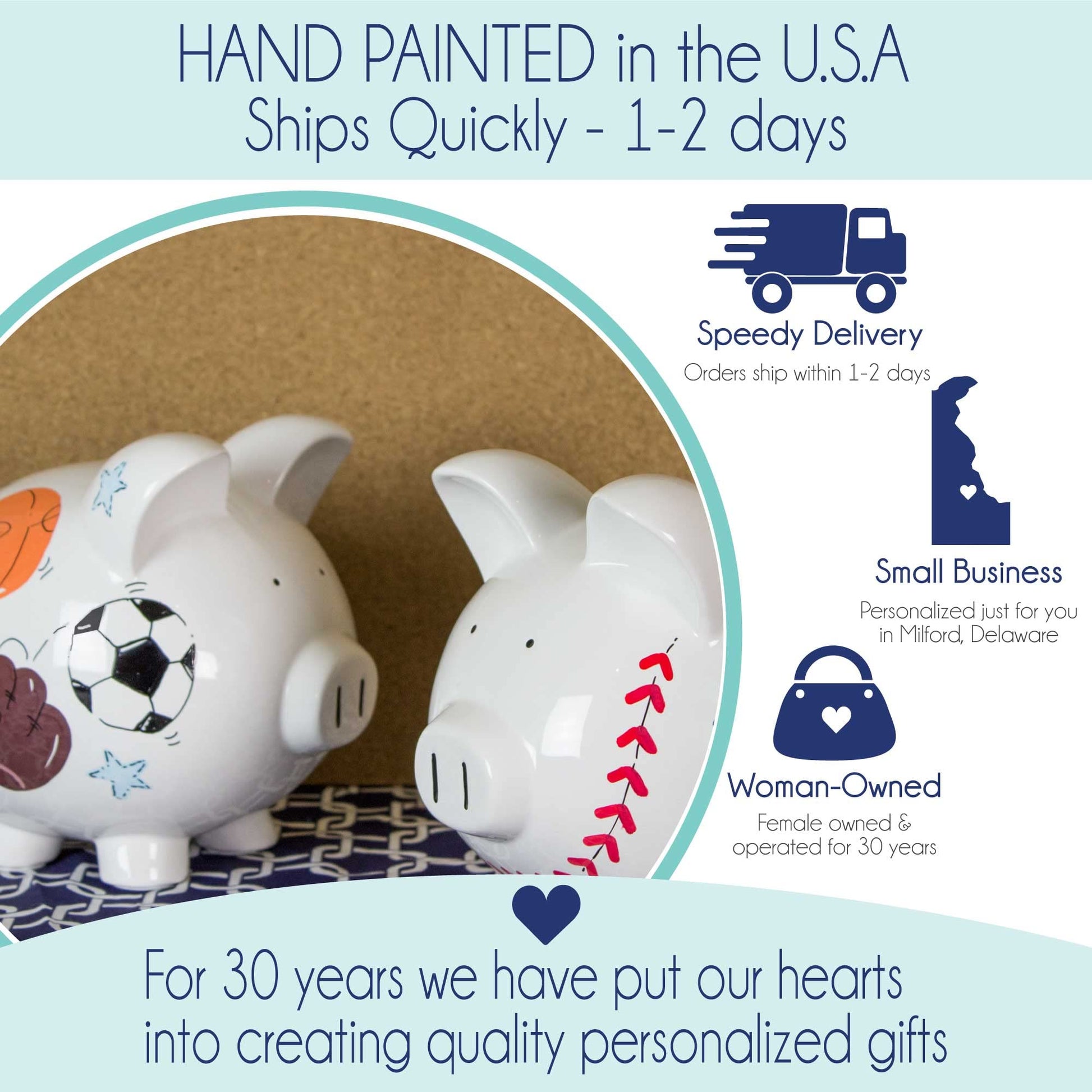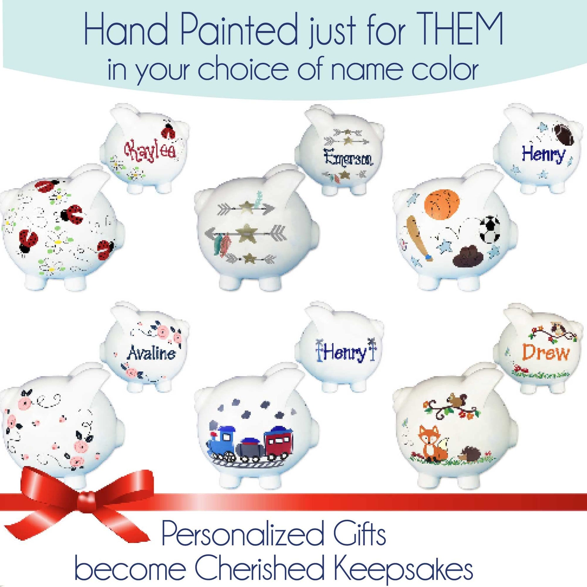 Classic White Ceramic Piggy Bank is hand-painted and personalized to order with our exclusive design and the name or short message in your choice of color. My Bambino's top selling baby gift for 30 years. Certified Lead Free, Non-Toxic Paint. Coin slot on top takes folded dollar bills too. Removable rubber/plastic plug on the bottom for early withdrawals. Measures Large 8'' x 7'' x 6'' .