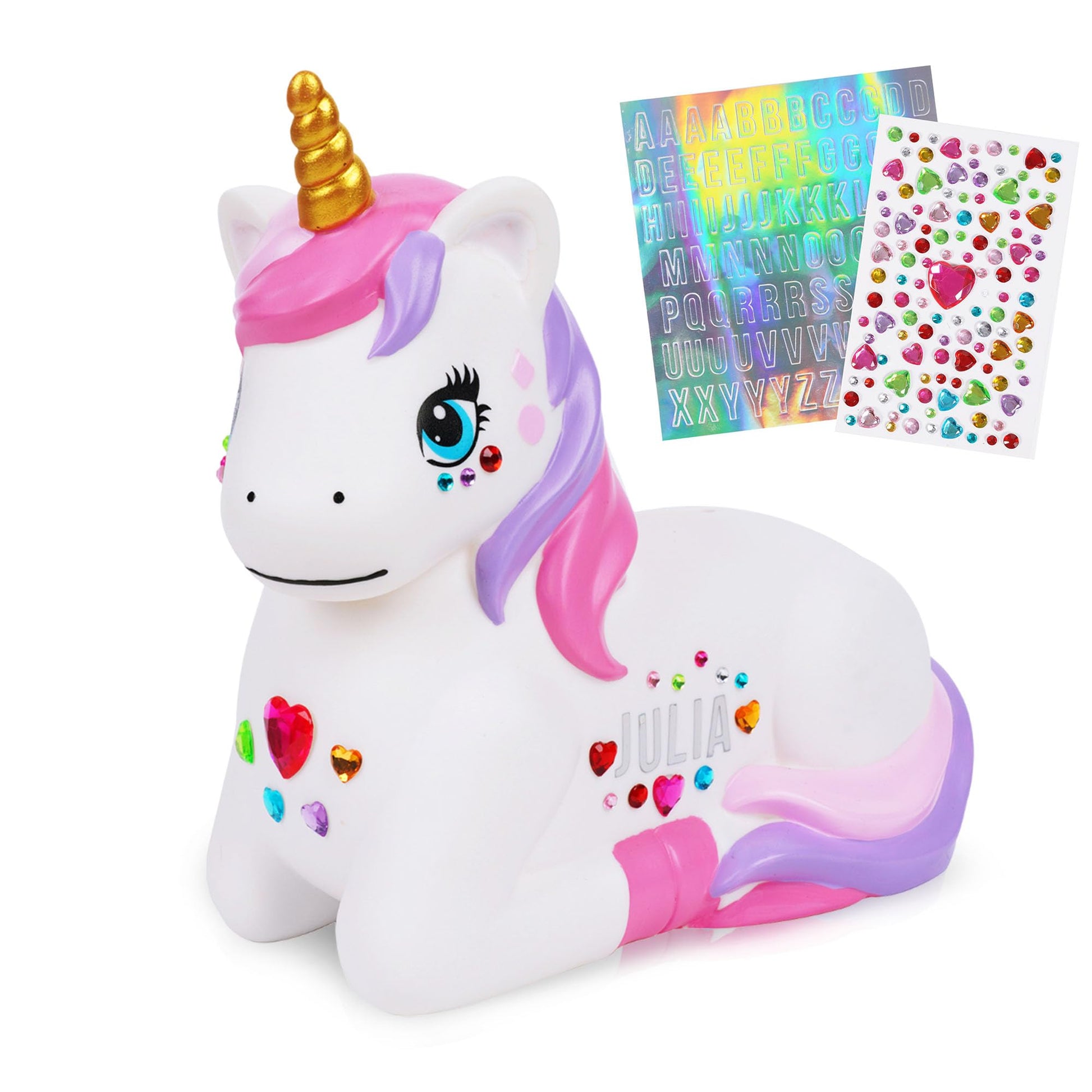 - Q: How can my child personalize the piggy bank? A: The unicorn piggy bank comes with personalized stickers and jewels, allowing your child to decorate and customize it according to her preferences, making saving money a fun and engaging activity.