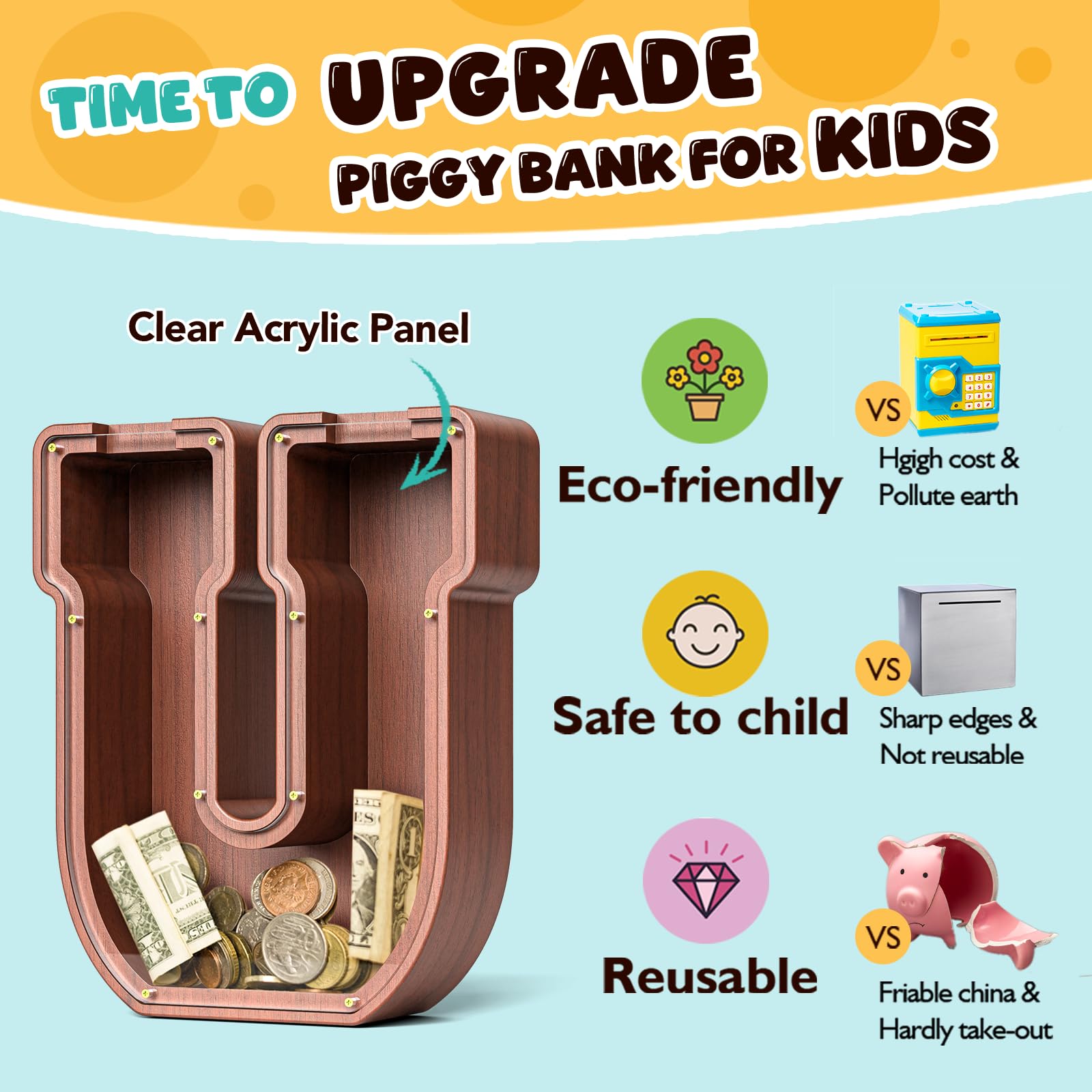 ?enhanced Quality & Craftsmanship?Our wood piggy bank Made of 100% organic wood with natural oil finishing smooth and durable. Carefully polished multiple times to ensure no burrs or rough edges.The extra thick size of this letter bank is 9.1x1.6 inch big enough to hold both coins and cash while staying stable on any surface. | ? Montessori Educational Toy?Clear acrylic piggy bank allows kids to see their savings grow encouraging financial awareness responsibility and the joy of progress from an early age.The included letter stickers can be used to DIY your child 's own piggy bank | ?Unique Design?Stylish as a bookshelf decor living room ornament makes it suitable not only as a wood letter bank but also as decoration wedding card box keepspirit-inspired flavor that can be used for years. Unscrew for hassle-free access to savings | ?Perfect & Meaningful Gift?Ideal for birthdays baby showers Christmas Easter or back-to-school surprises. A timeless and practical present for kids and families. | ?Reliable After-Sales Support?We provide prompt customer service and offer personalization options. Your satisfaction and your child